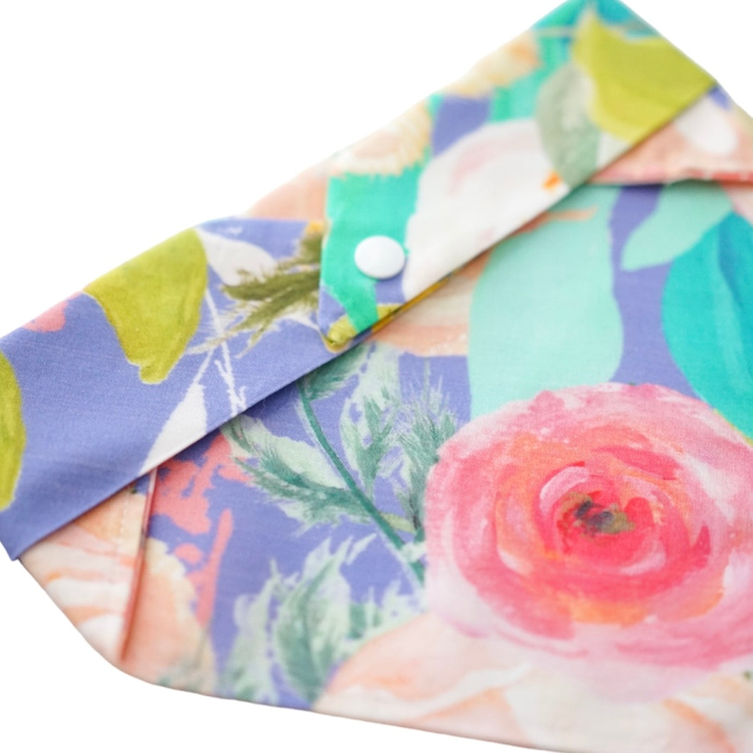 Lightly padded and soft to the touch, with a sweet mix of blush, peach, and periwinkle florals.