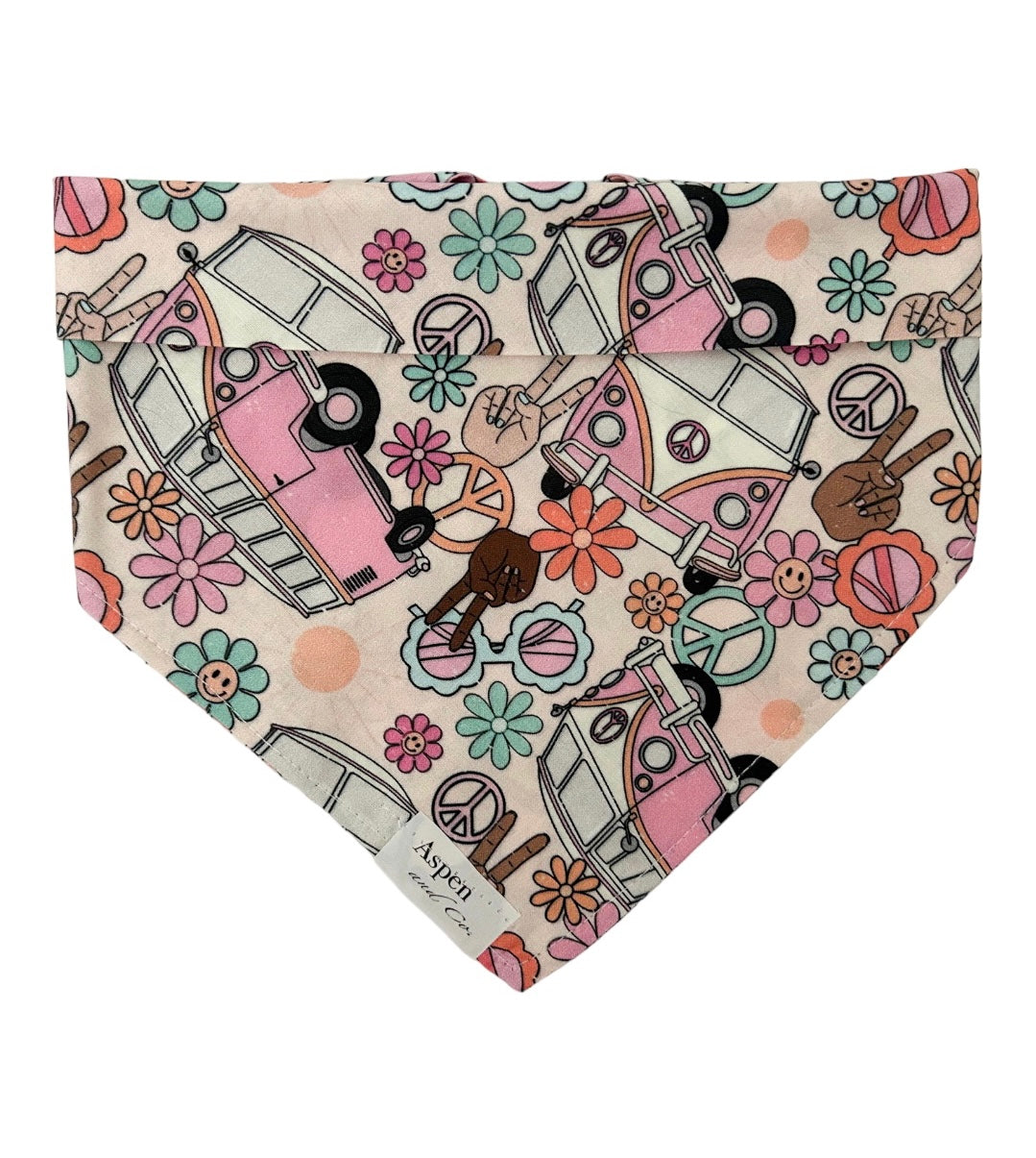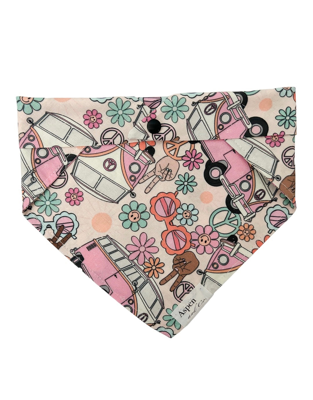 Get your pup ready for summer adventures with our Campervan Dog Bandana! Handmade with 2 layers of premium cotton, this bandana is not only stylish but also comfortable for your furry friend. The retro camper vans, peace symbols, and daisies add a touch of playfulness and good vibes to your dog's look. Comes with naps for easy and secure fastening. (For chill dogs only. Peace out!)