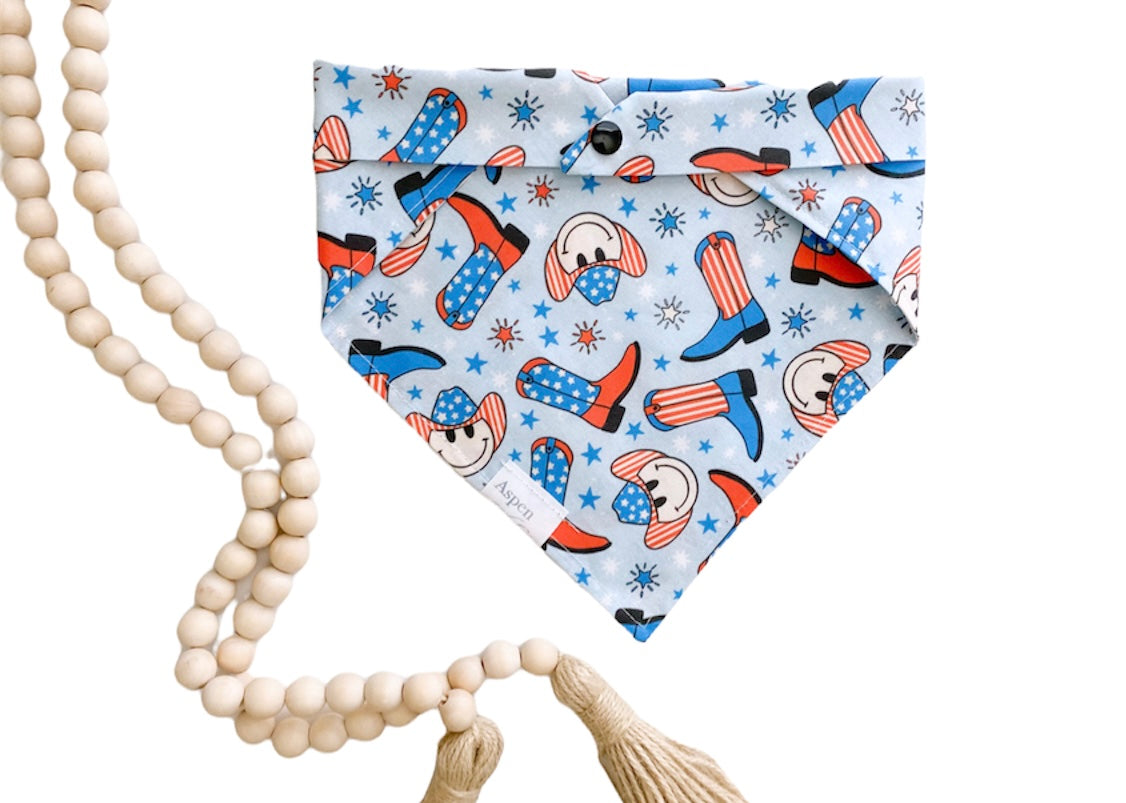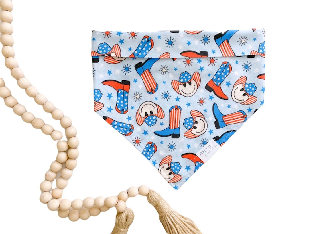 Saddle up your pup in patriotic style with our Cowboy USA bandana! Featuring a cowboy hat and boots in red, white, and blue, this bandana is perfect for celebrating the 4th of July. Your dog will be the most stylish pup at the parade (and maybe even win a few "Best Dressed" awards). Yee-haw!