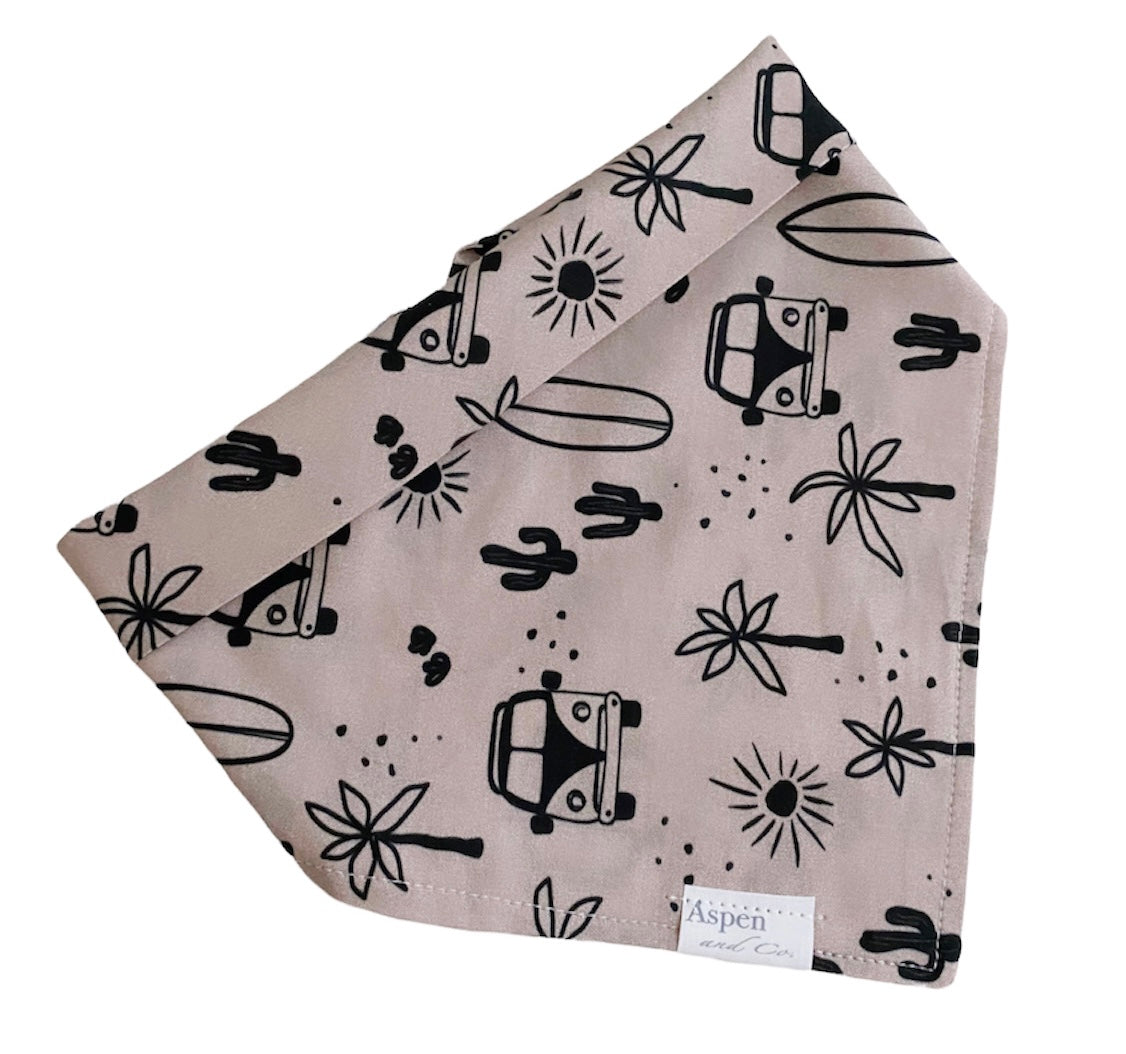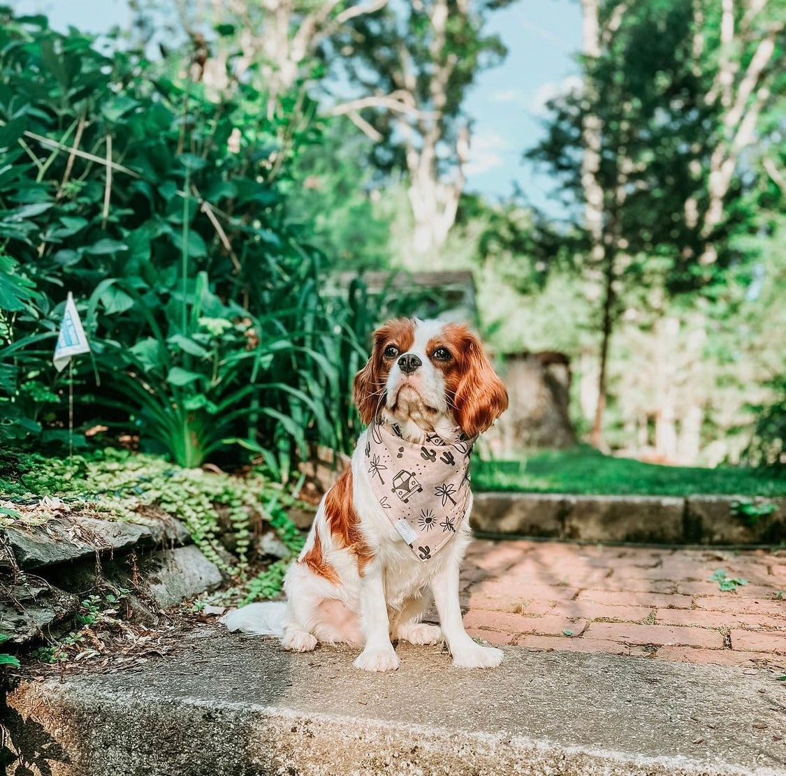 Bring out your dog's adventurous side with Vagabond. Featuring a tan background with vintage camper vans, cactuses, palm trees, and surfboards, this bandana is perfect for the ultimate road trip or beach loving canine. Your furry companion will be turning heads and making a statement on all your summer adventures.