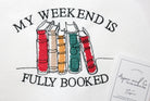 Show off your bookish side with our embroidered My Weekend is Fully Booked sweatshirt. Handmade in California, each design features a stack of books and stitched lettering, perfect for readers who live for quiet weekends and cozy chapters.