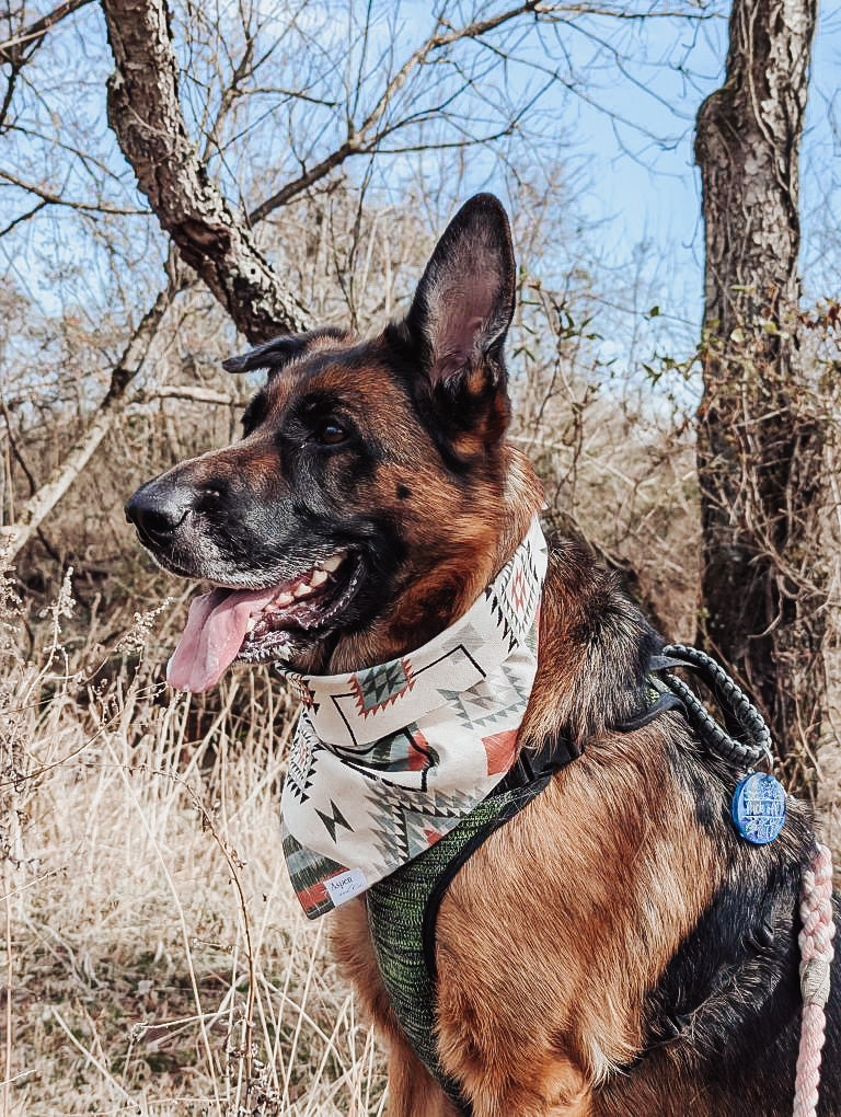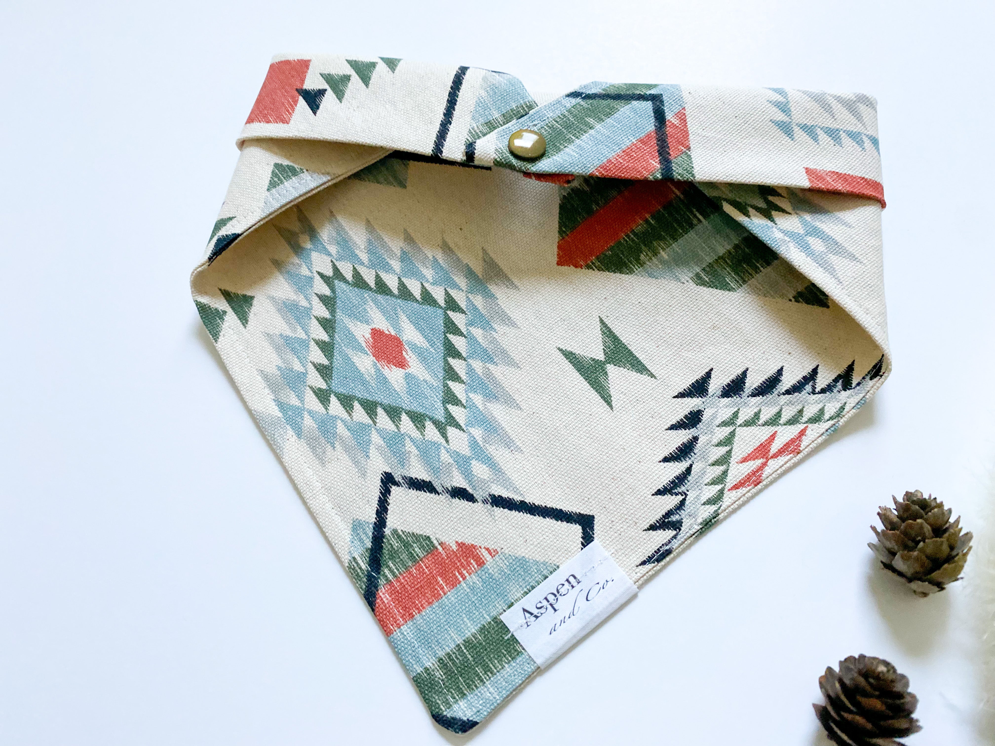 Add a touch of rustic charm to your pup's wardrobe with the Jasper bandana from the Clay Collection. Made from durable cotton canvas, this bandana features a south western inspired geometric print, perfect for any adventurous canine companion. Your dog will be the envy of every trail and park.
