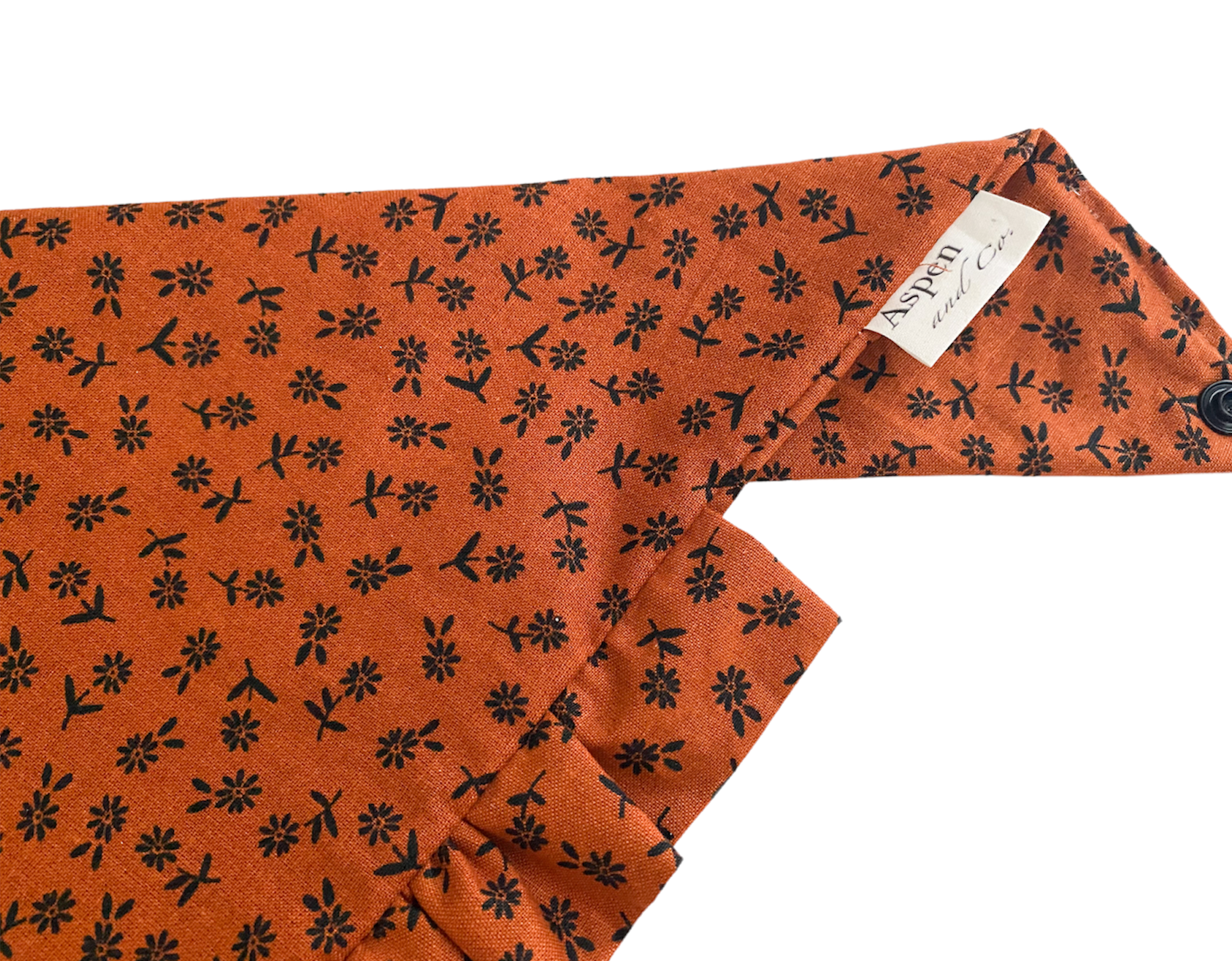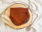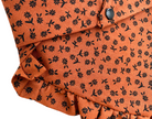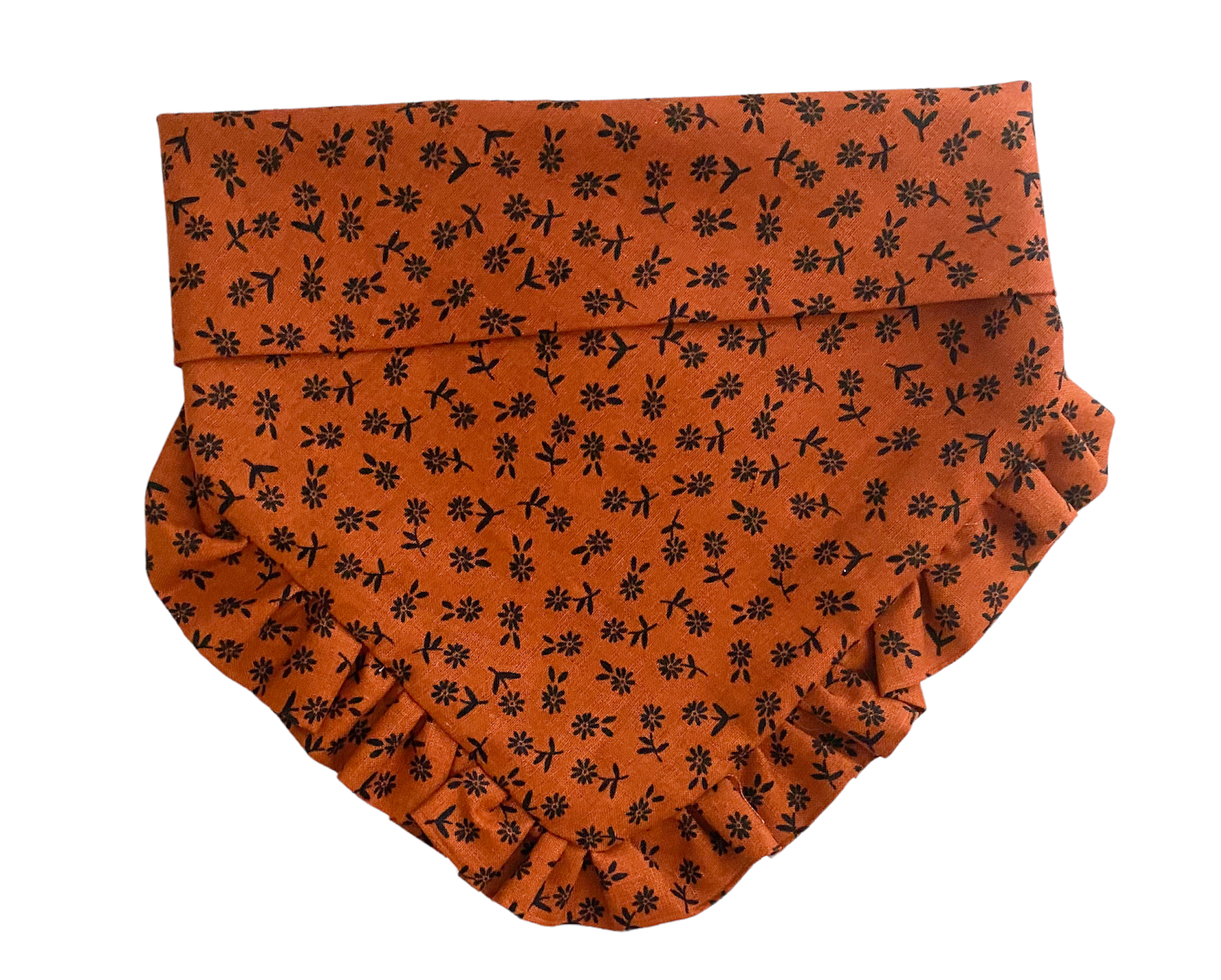 Elevate your pup's style with our Rust Florals with Ruffles Dog Bandana. The petite black flowers in rust-colored fabric exude sophistication, while the handcrafted ruffled trim adds a touch of luxury. Convenient snaps make it easy to dress up your furry friend. Perfect for the fall season.