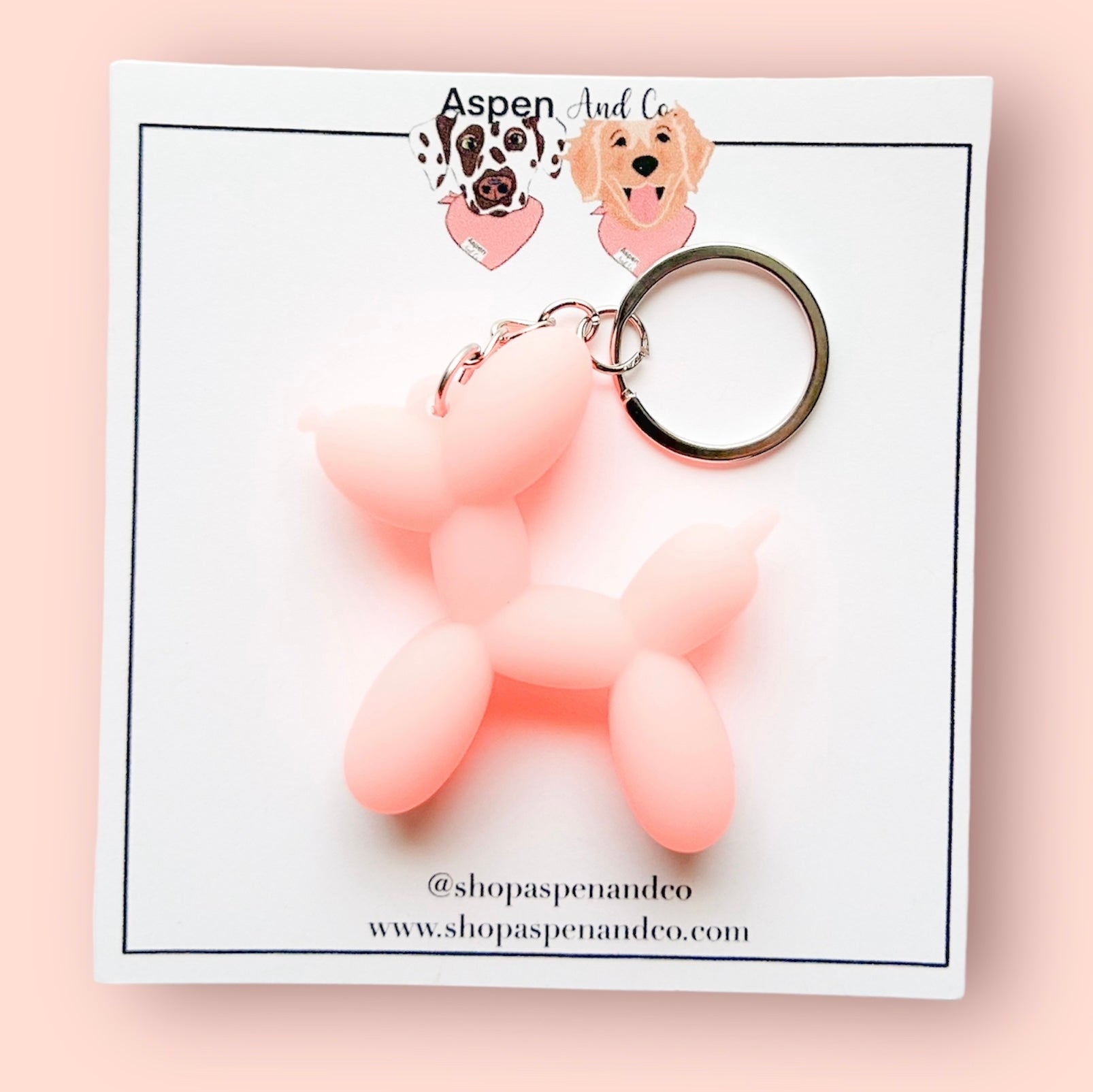 This coral-colored keychain is inspired by balloon animals and features a playful silicone dog charm. Attached to metal ring, it's the perfect accessory for any dog lover. Keep your keys organized in a fun and unique way with this dog keychain!