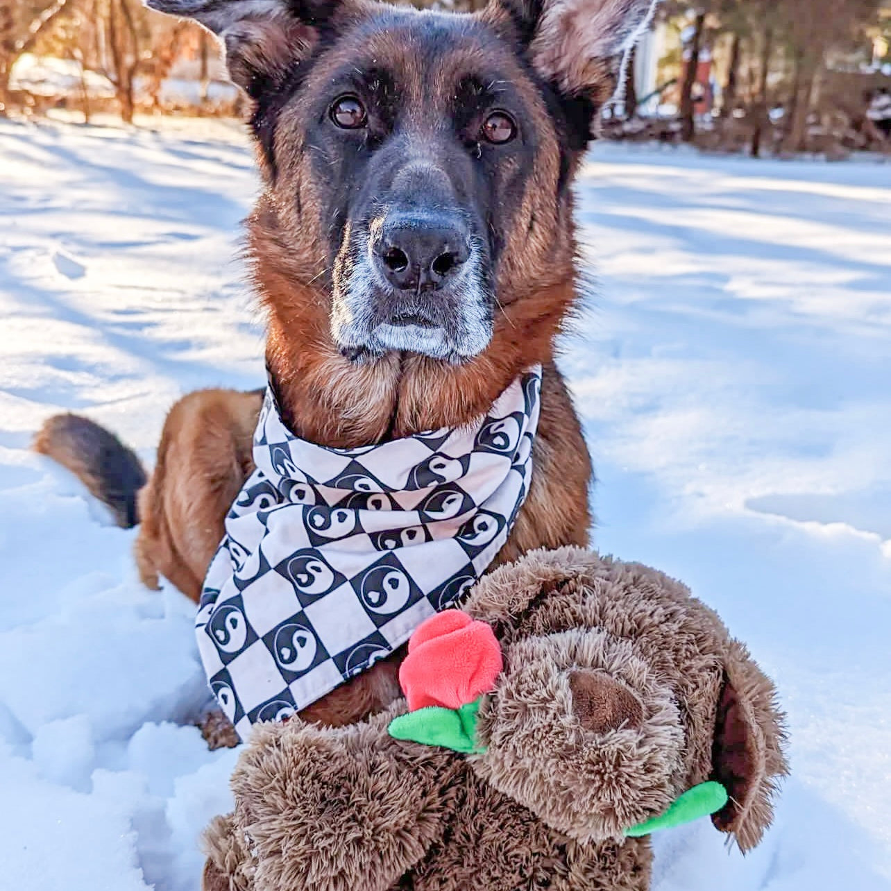 Adorable Bernese Mountain Dog puppy wearing a cool-toned red embroidered bandana with beige stitching that says “Self Love Club” inside a heart; stylish mental health-themed pet accessory.