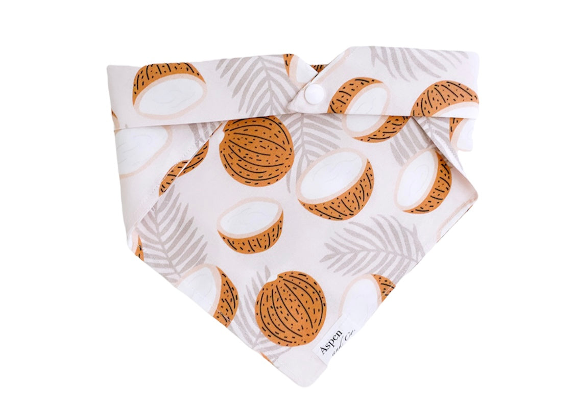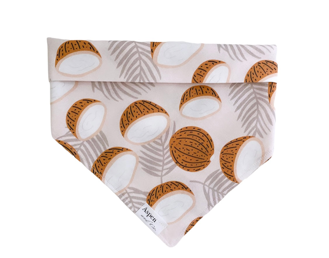 Get ready to strut your pup's style in Coco Cabana! This premium cotton bandana features a playful print of coconuts and palm leaves in neutral colors, handmade in California for that extra touch of care. Your furry friend will be the talk of the block with this quirky and fun accessory. (Just don't let them eat the coconuts!)