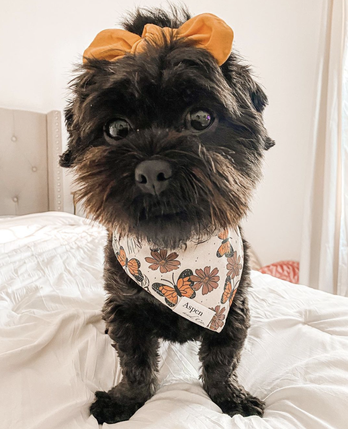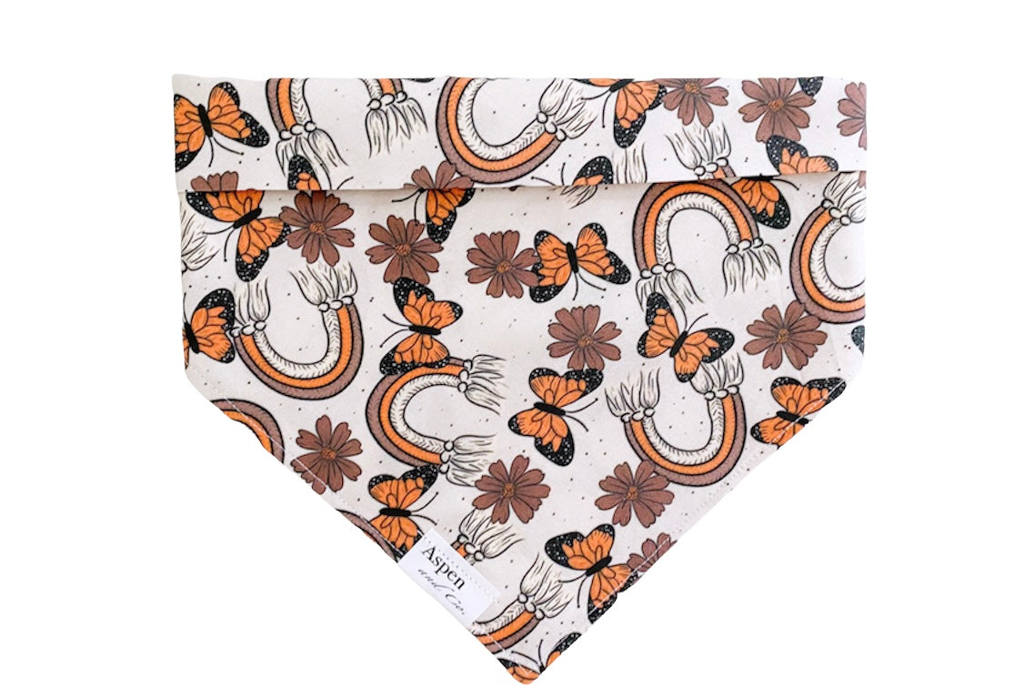 Hand crafted from premium cotton, this bandana features beautiful boho butterflies, rainbows, and printed playful tassels. Let your pup's fashion sense take flight with this stylish and exclusive accessory.