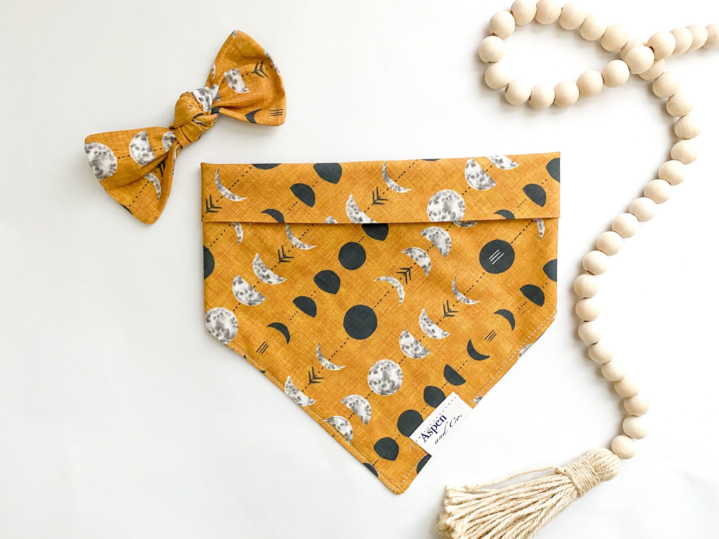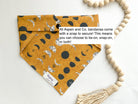 Unleash your pup's inner astrology enthusiast with our "It's All a Phase" bandana! In a trendy mustard hue adorned with black and grey moon phases, this premium cotton bandana comes with snaps. Pair with our matching dog bow (sold separately) for a stellar look.