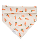 Dress your pup in style with our carrot dog bandana. Made from premium cotton and handcrafted in Southern California, this bandana features a neutral tan background with muted orange carrots, perfect for both boy and girl dogs. Add a touch of classic charm to your pup's look this Easter.