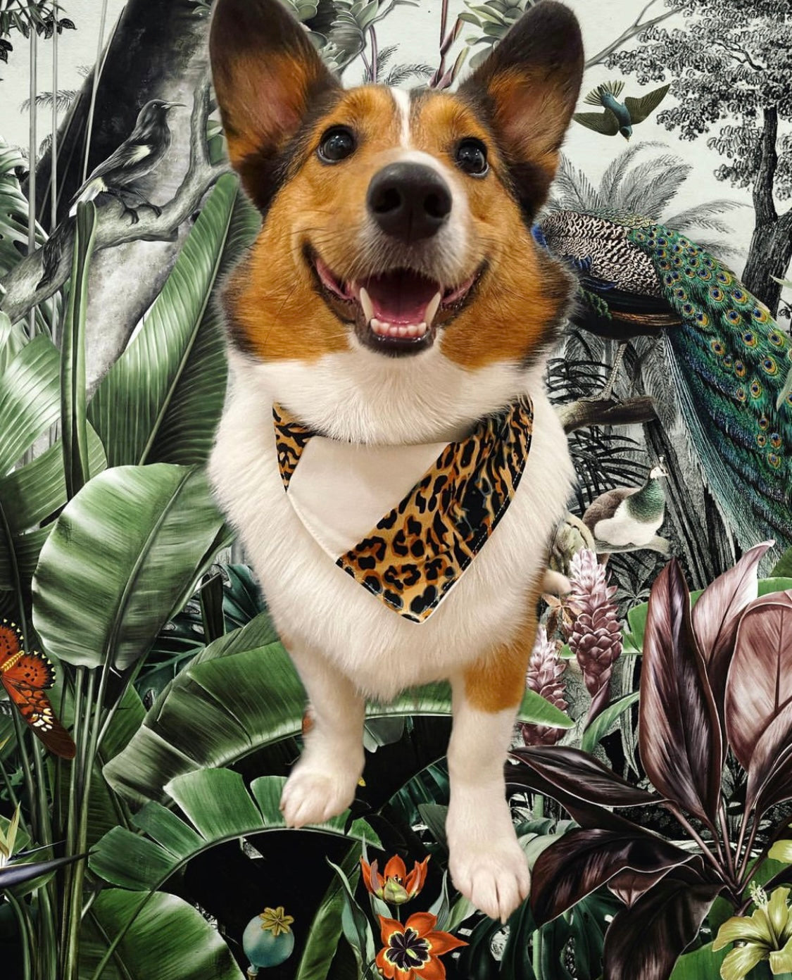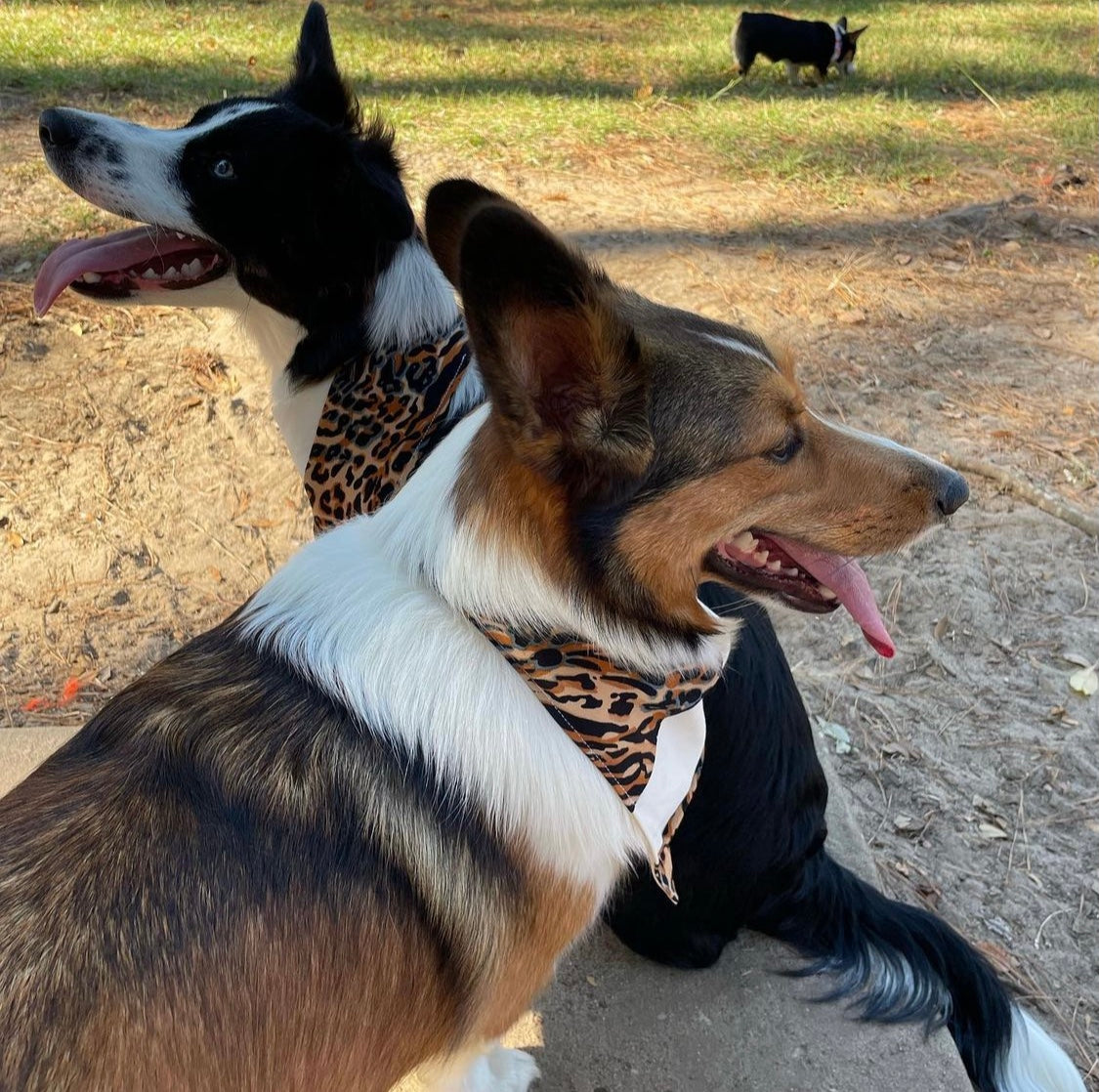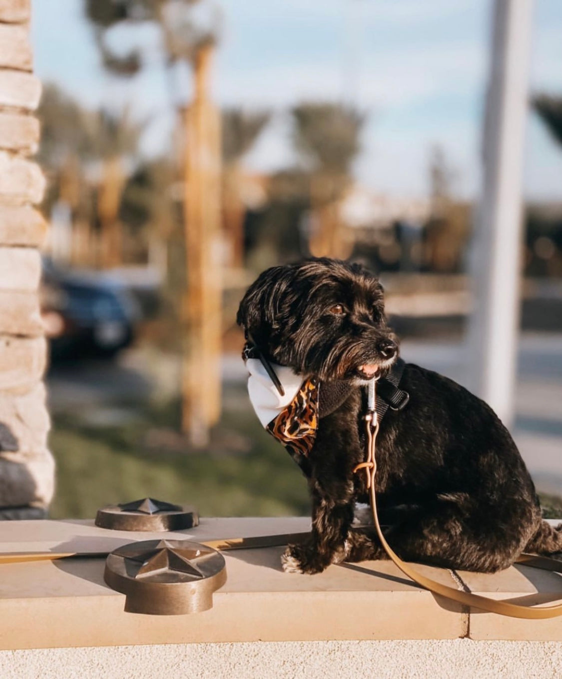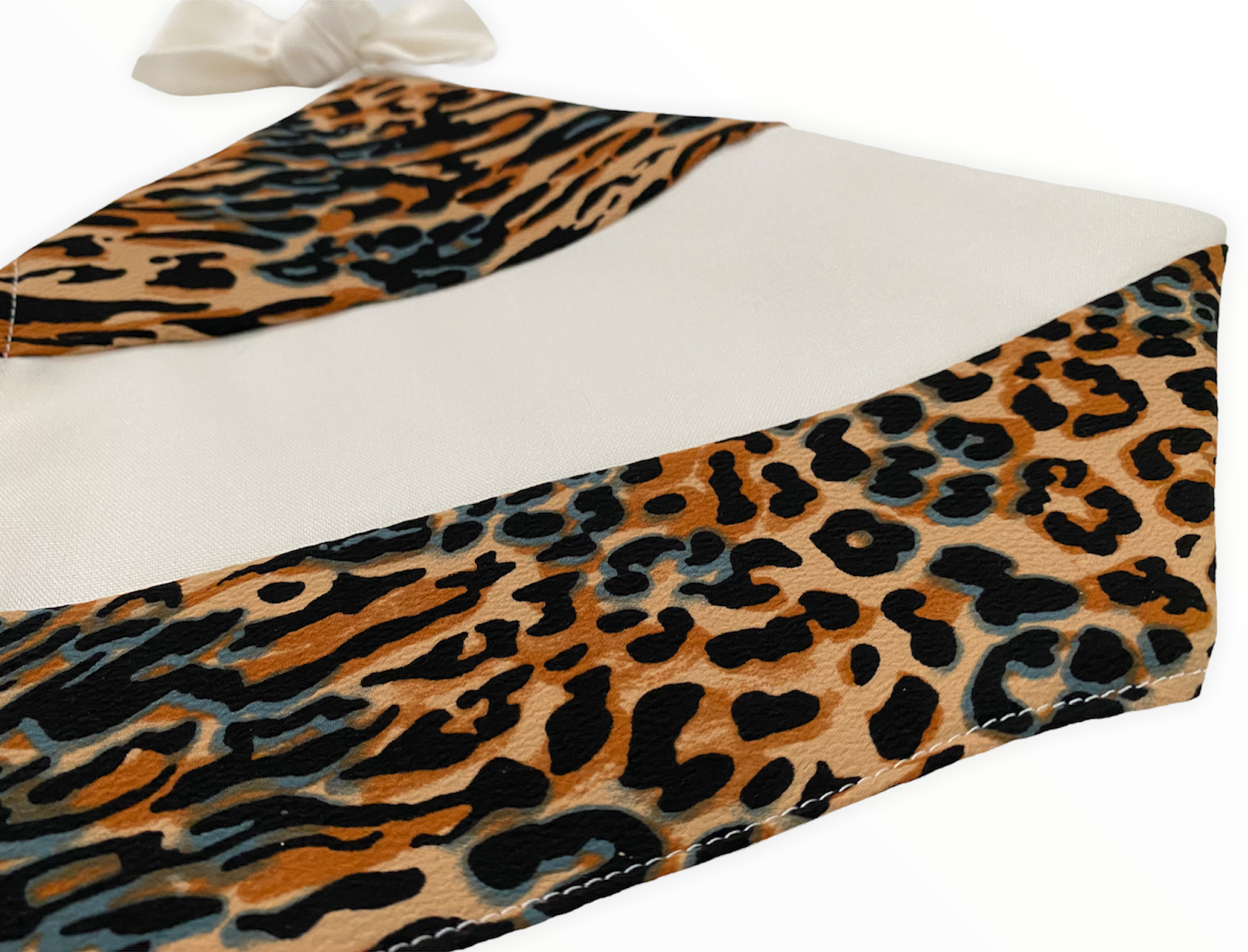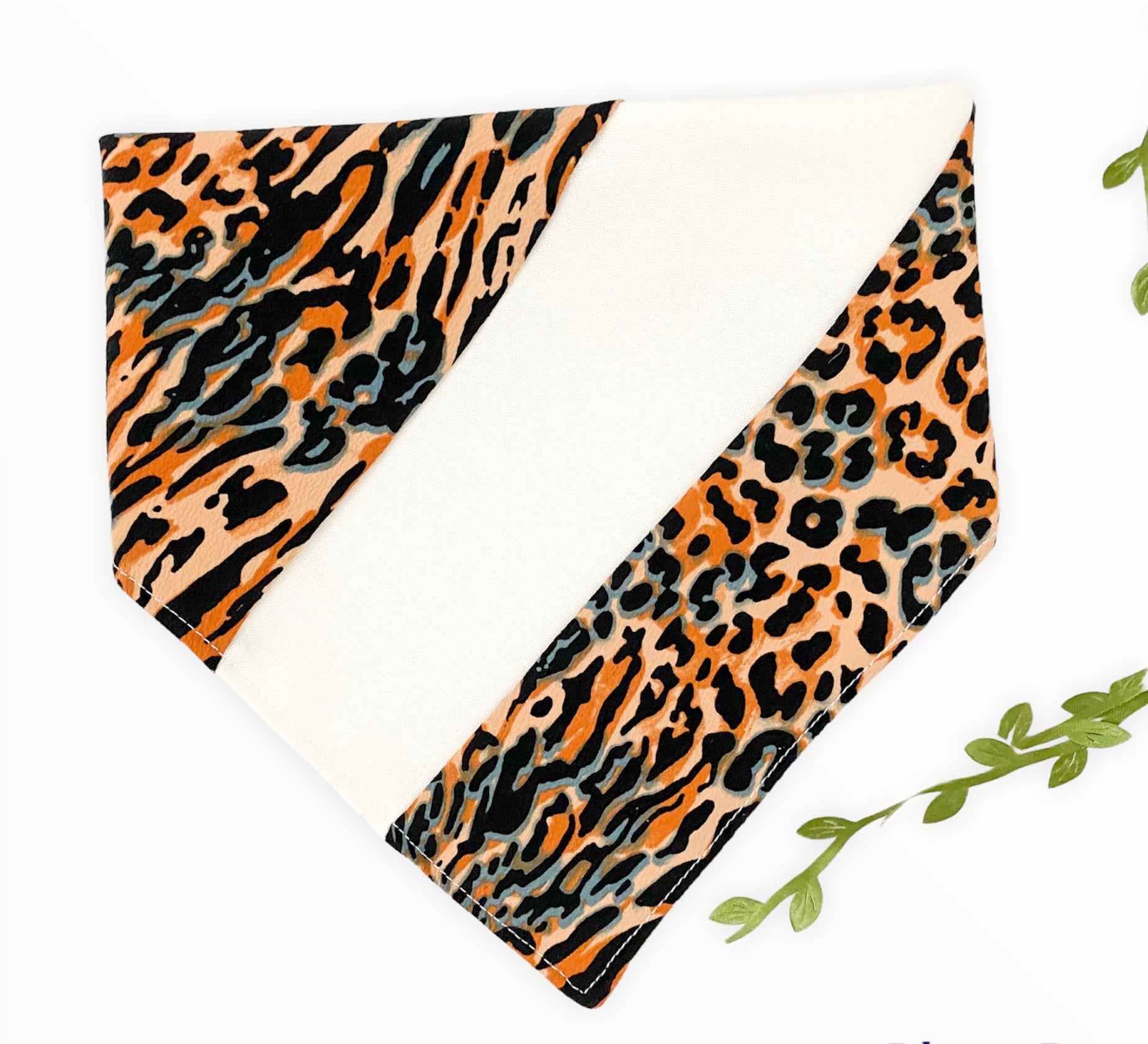 Elevate your pup's style with our Resort Collection - Belize Dog Bandana. Inspired by luxurious vacation resorts, it features hand-cut leopard patterned art panels, expertly pieced onto a woven linen textured solid. Finished with a faux-gold kam snap, this bandana exudes exclusivity and sophistication.