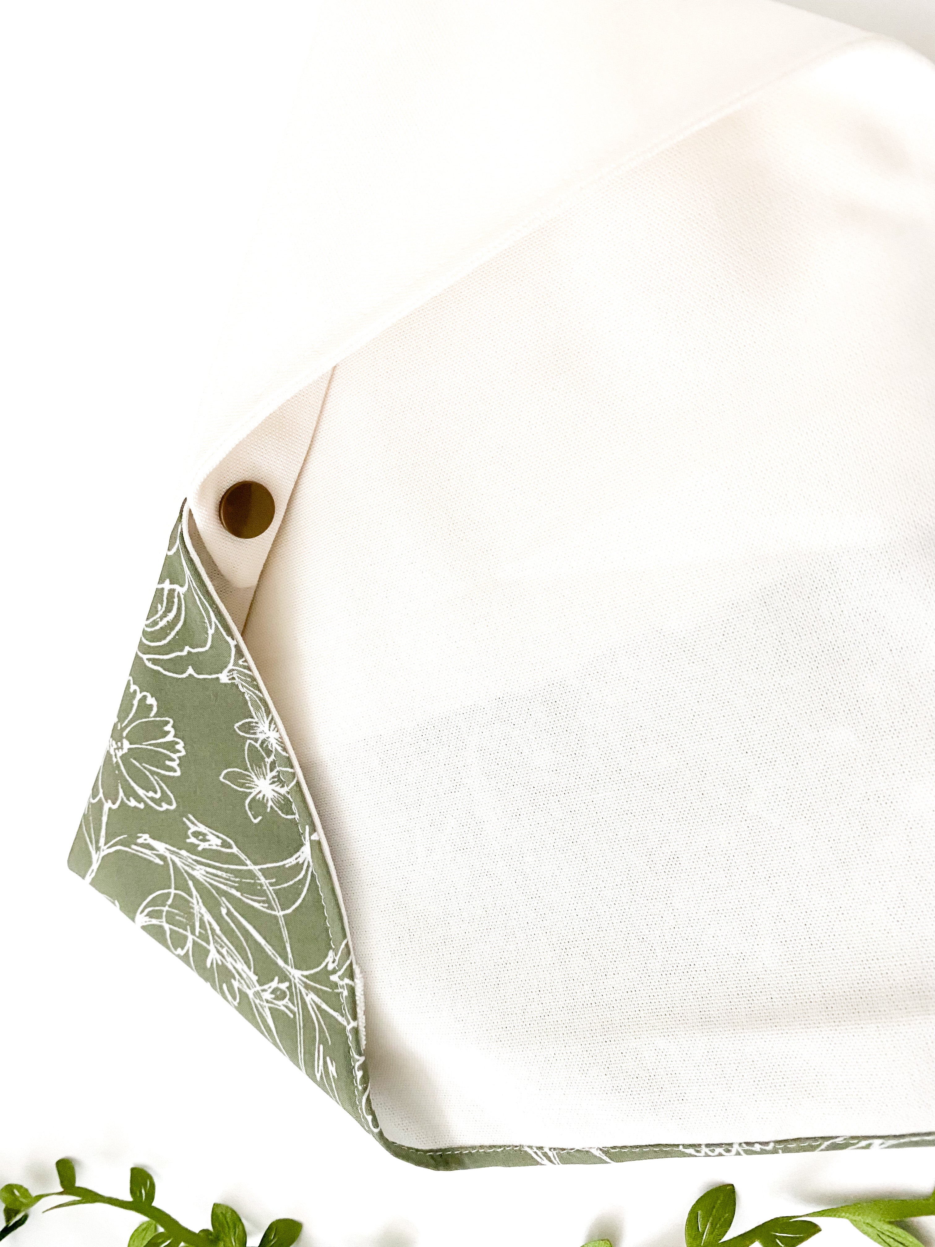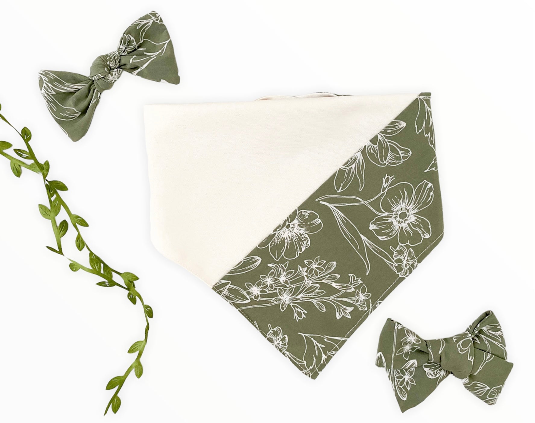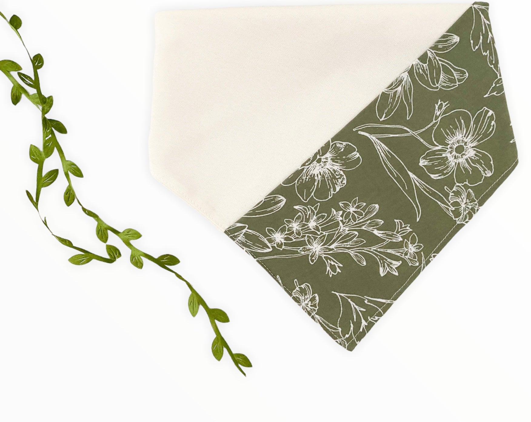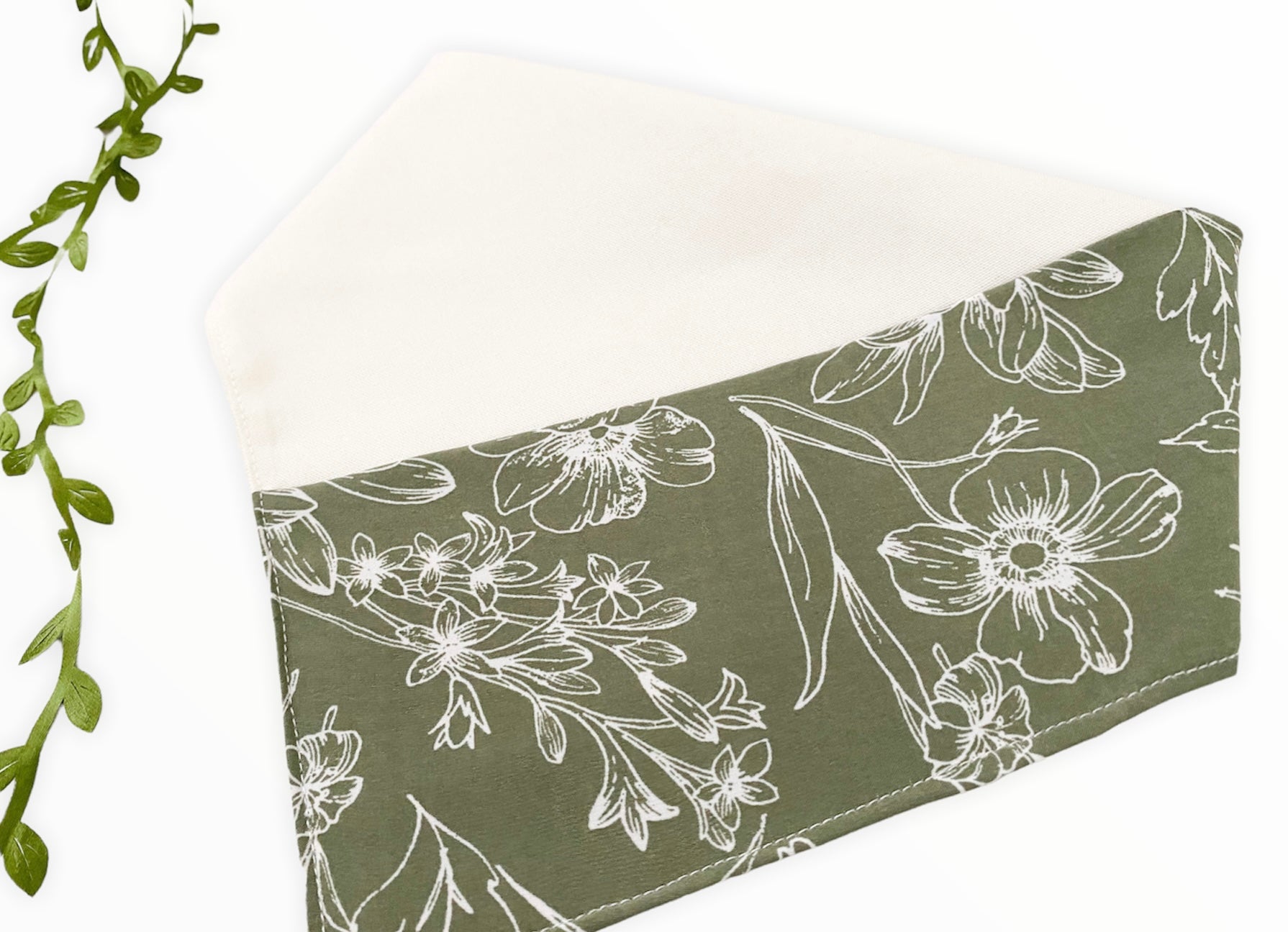 Indulge your furry friend with our St. Lucia Dog Bandana, featured in British Vogue. Our resort-inspired design features hand-cut panels in a sage pattern expertly pieced onto a woven linen texture. Faux-gold kam snap adds a touch of elegance. Constructed with charmuse and linen-like textured fabric.