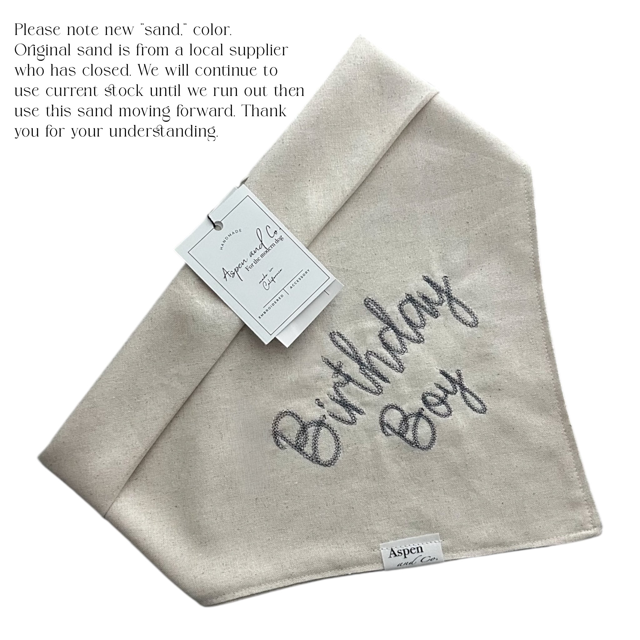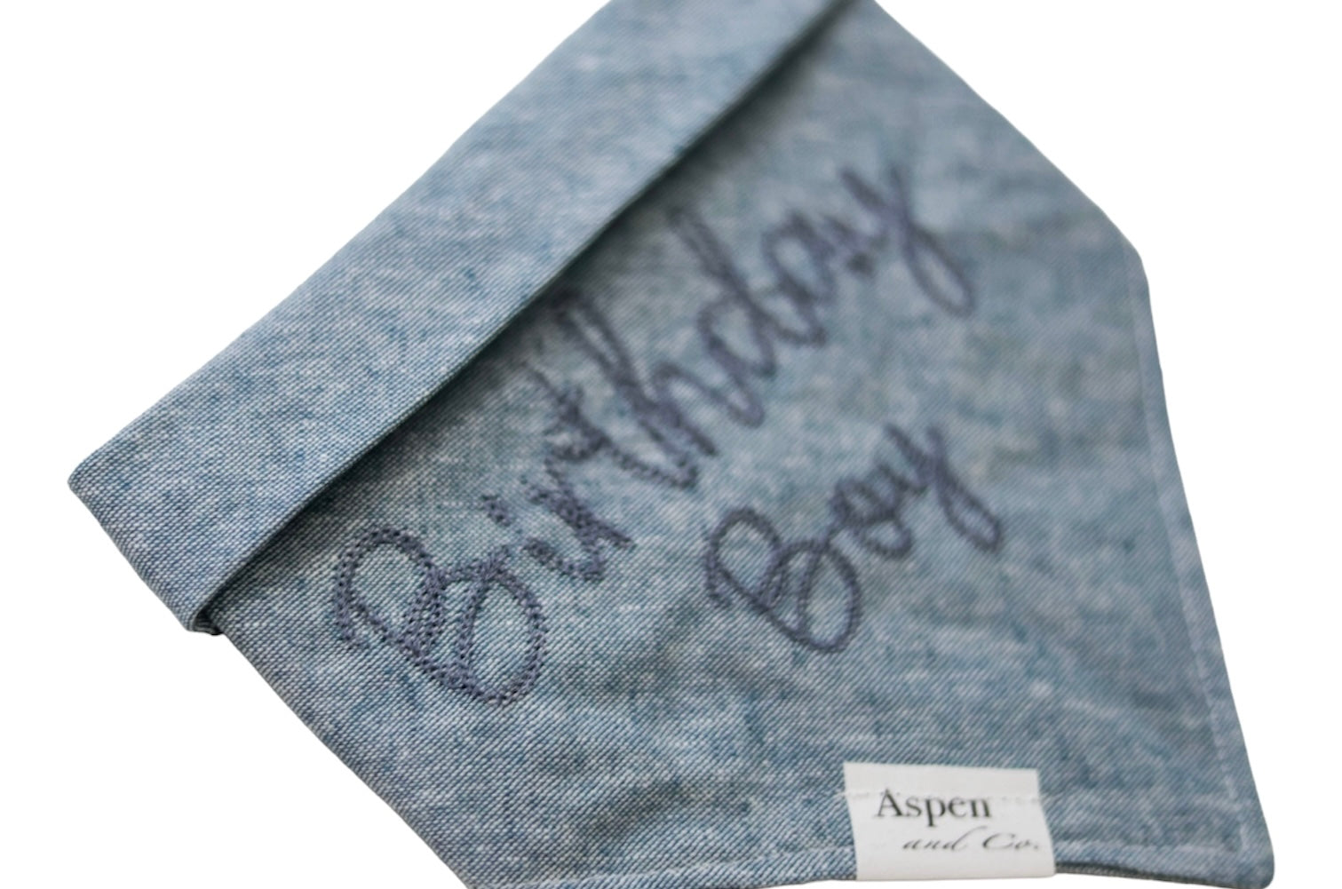 Unleash a new level of sophisticated celebration with our Embroidered Birthday Dog Bandana! Choose from a variety of custom embroidery thread colors to personalize your pup's special day. The linen blend fabric and secure snap placement make for a stylish and comfortable fit. Get ready to paw-ty in style!
