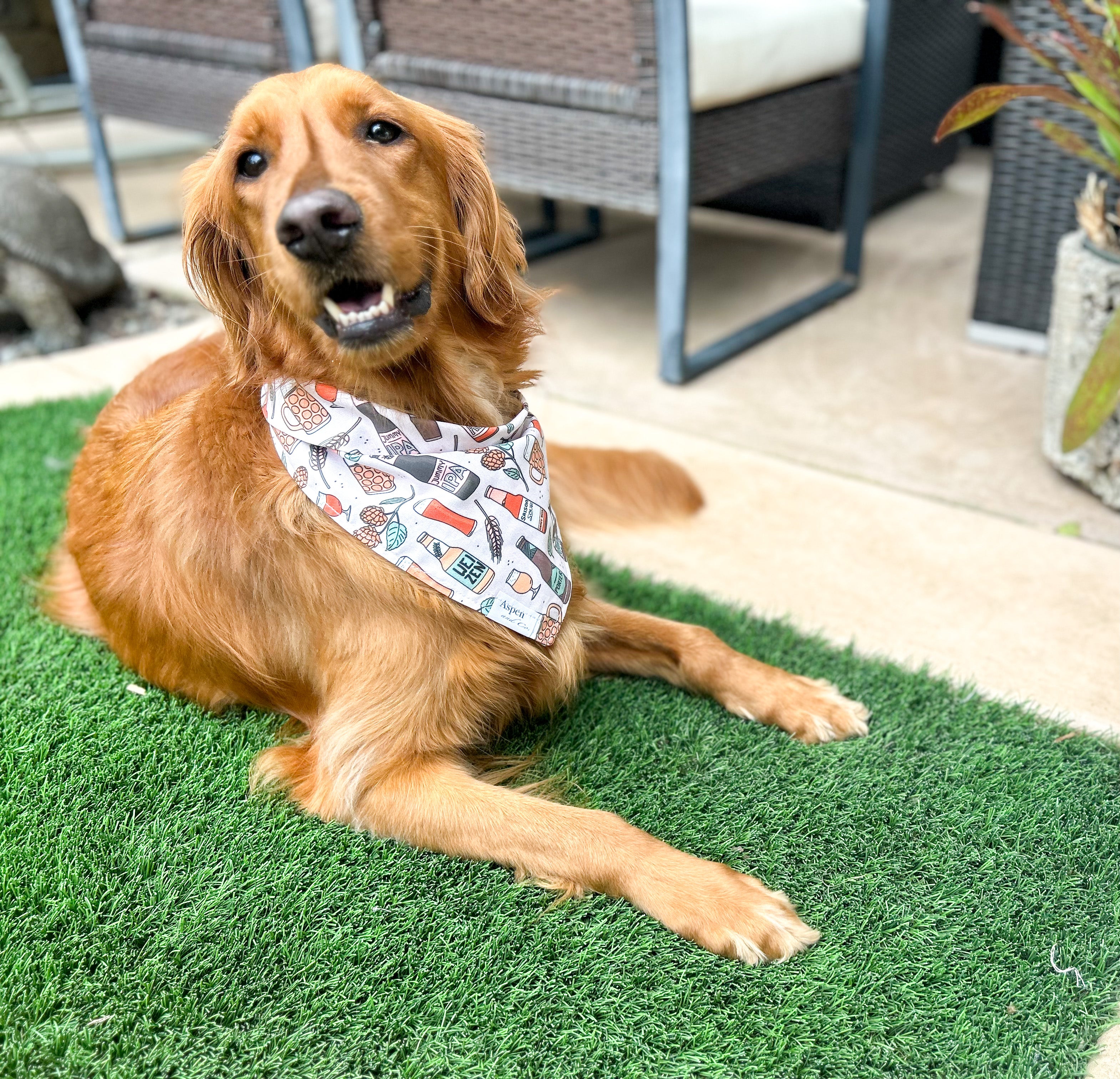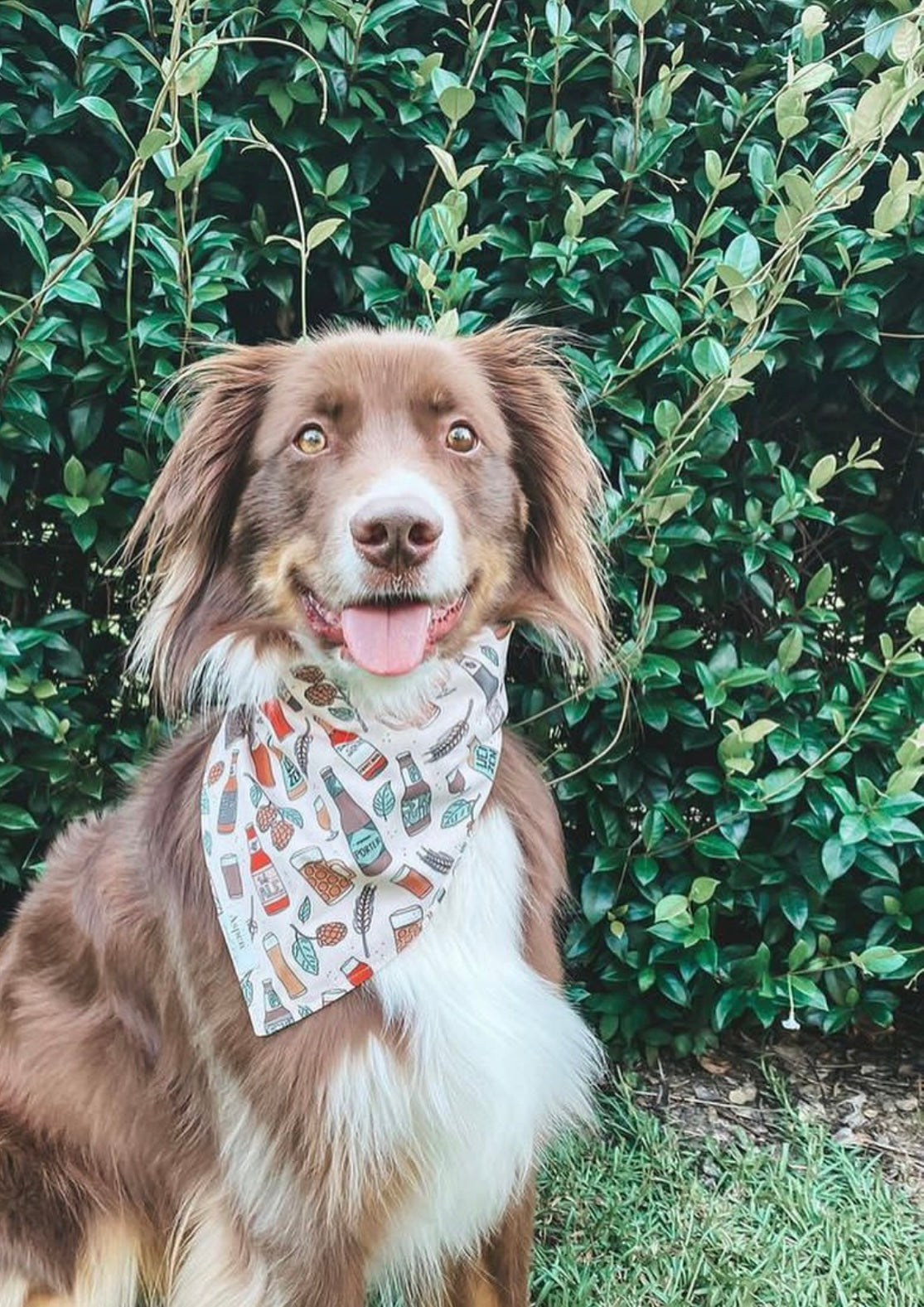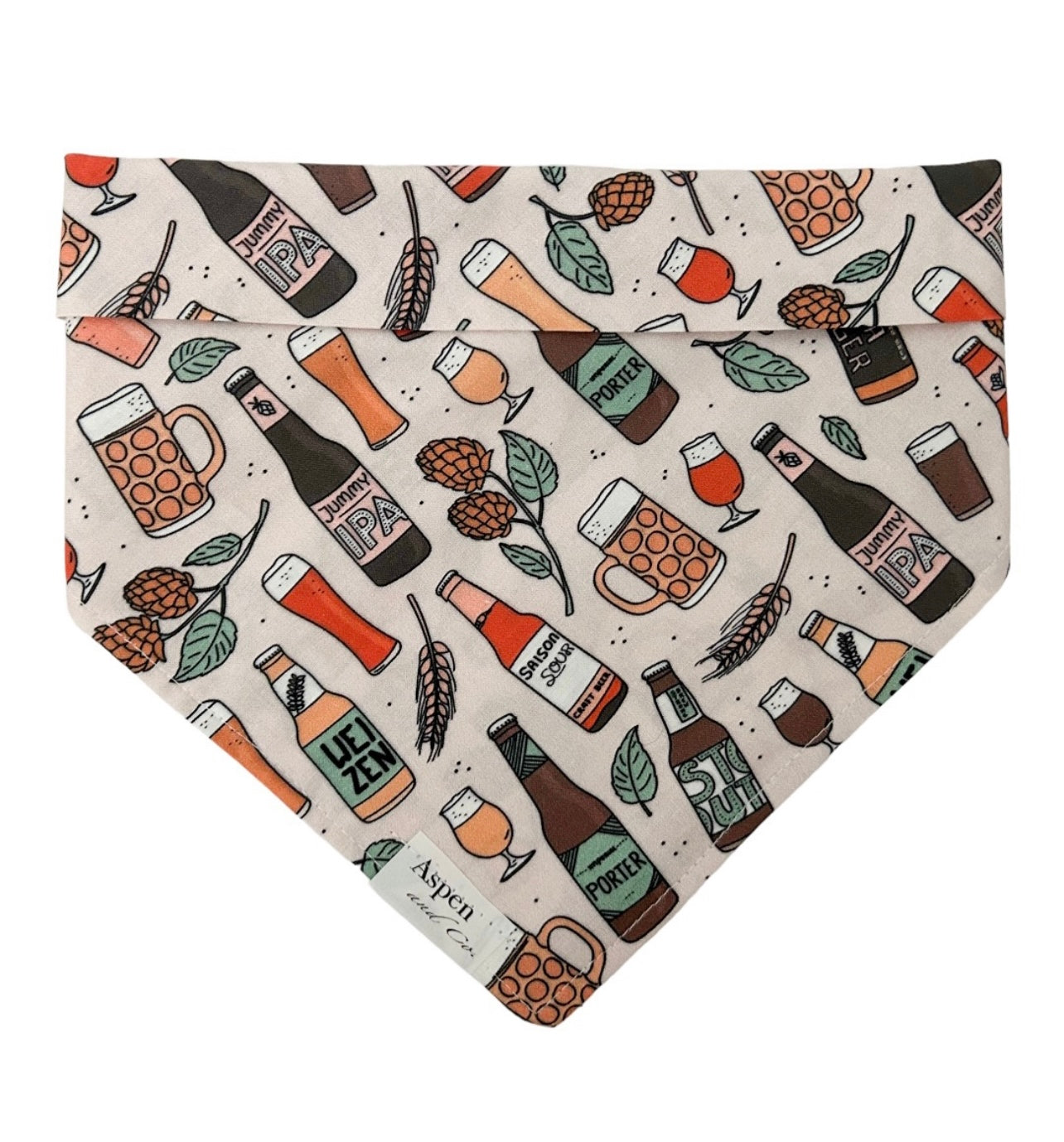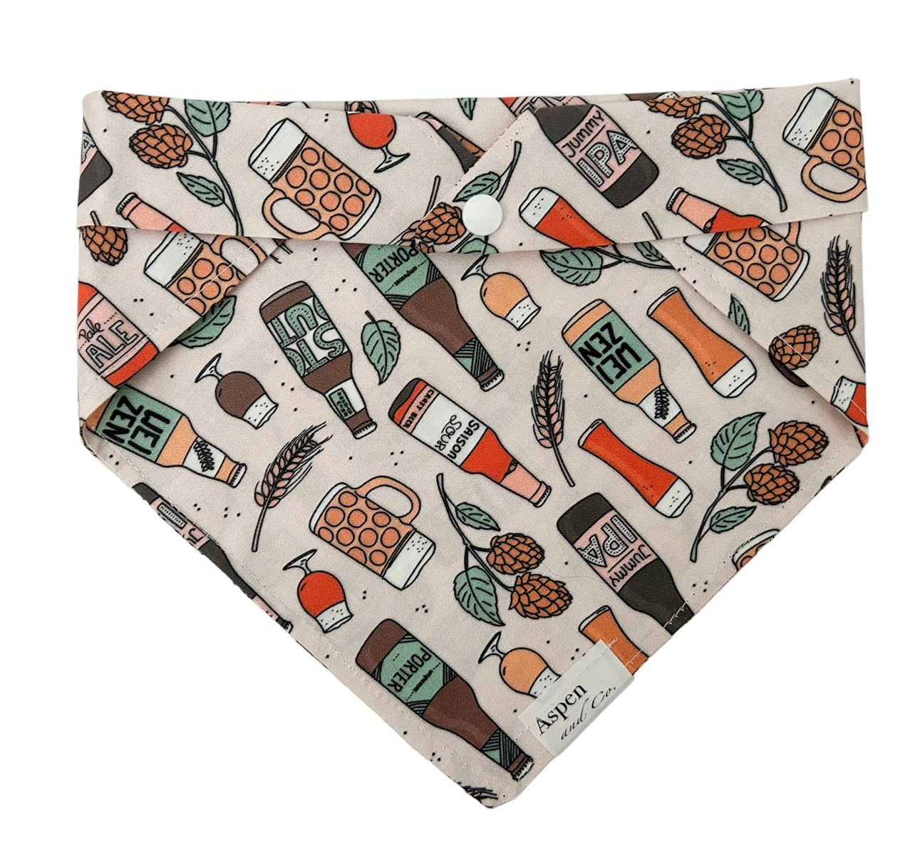 Your furry friend will be the talk of the brewery with this handmade dog bandana. Made with premium cotton, it's perfect for patio dining, beer loving romps and naps. Featuring a neutral tan background with a playful nod to assorted IPA beers this dog bandana is perfect for both boy or girl dogs.