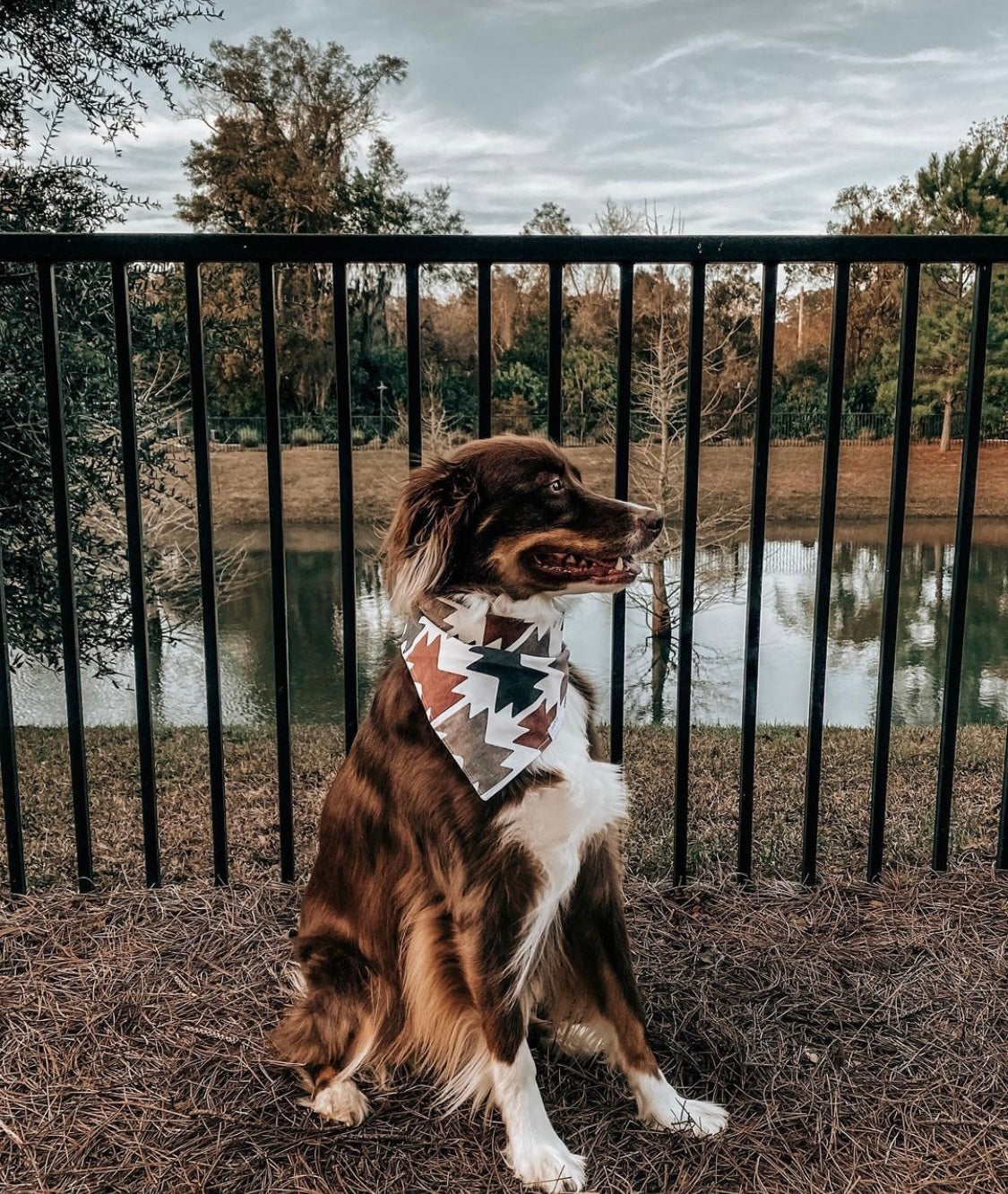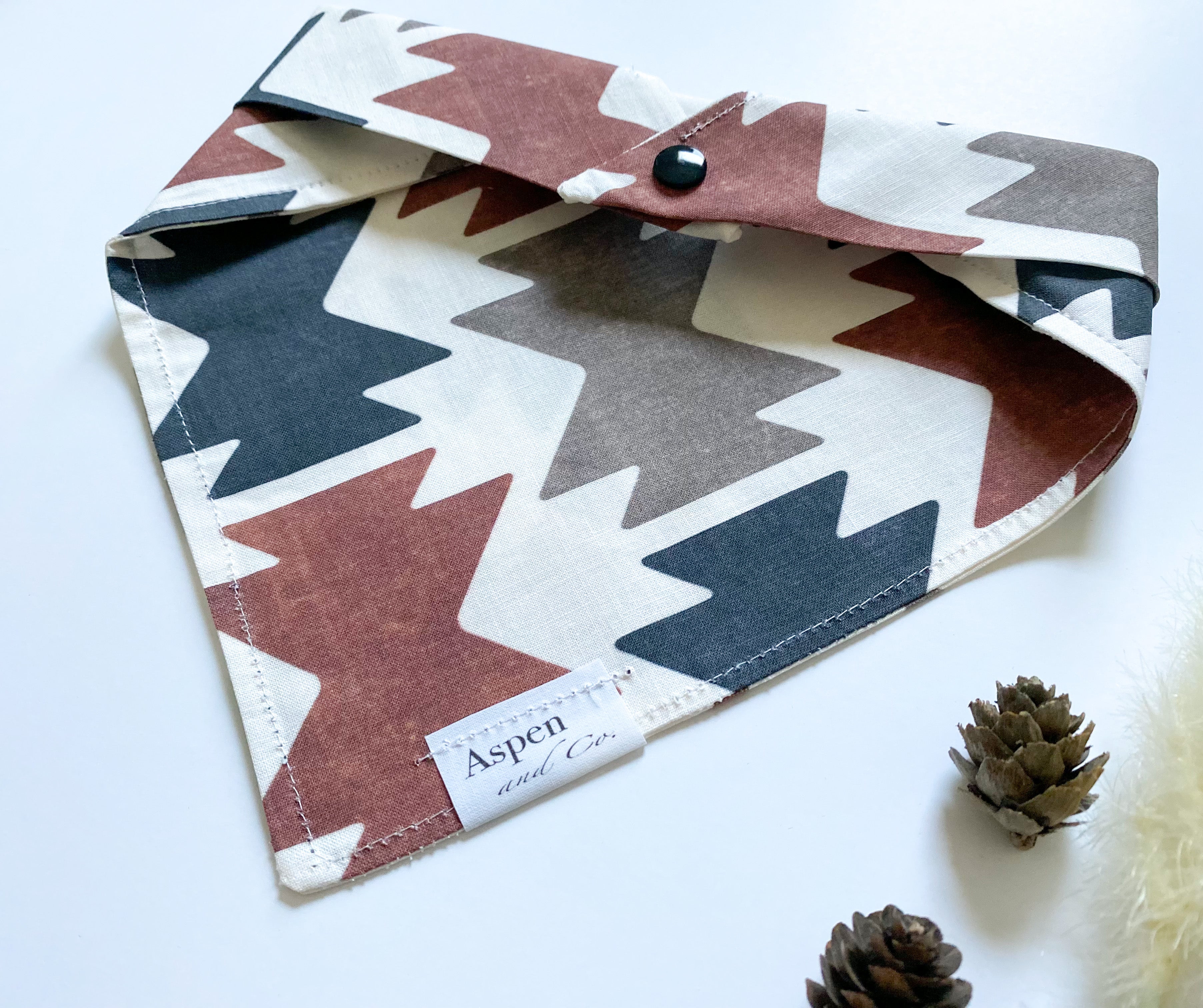Elevate your pup's style with our Acadia Dog Bandana from the exclusive Clay Collection. The aztec geometric design, inspired by the southwest, is crafted from premium cotton for a luxurious feel. Make a statement with this sophisticated accessory.