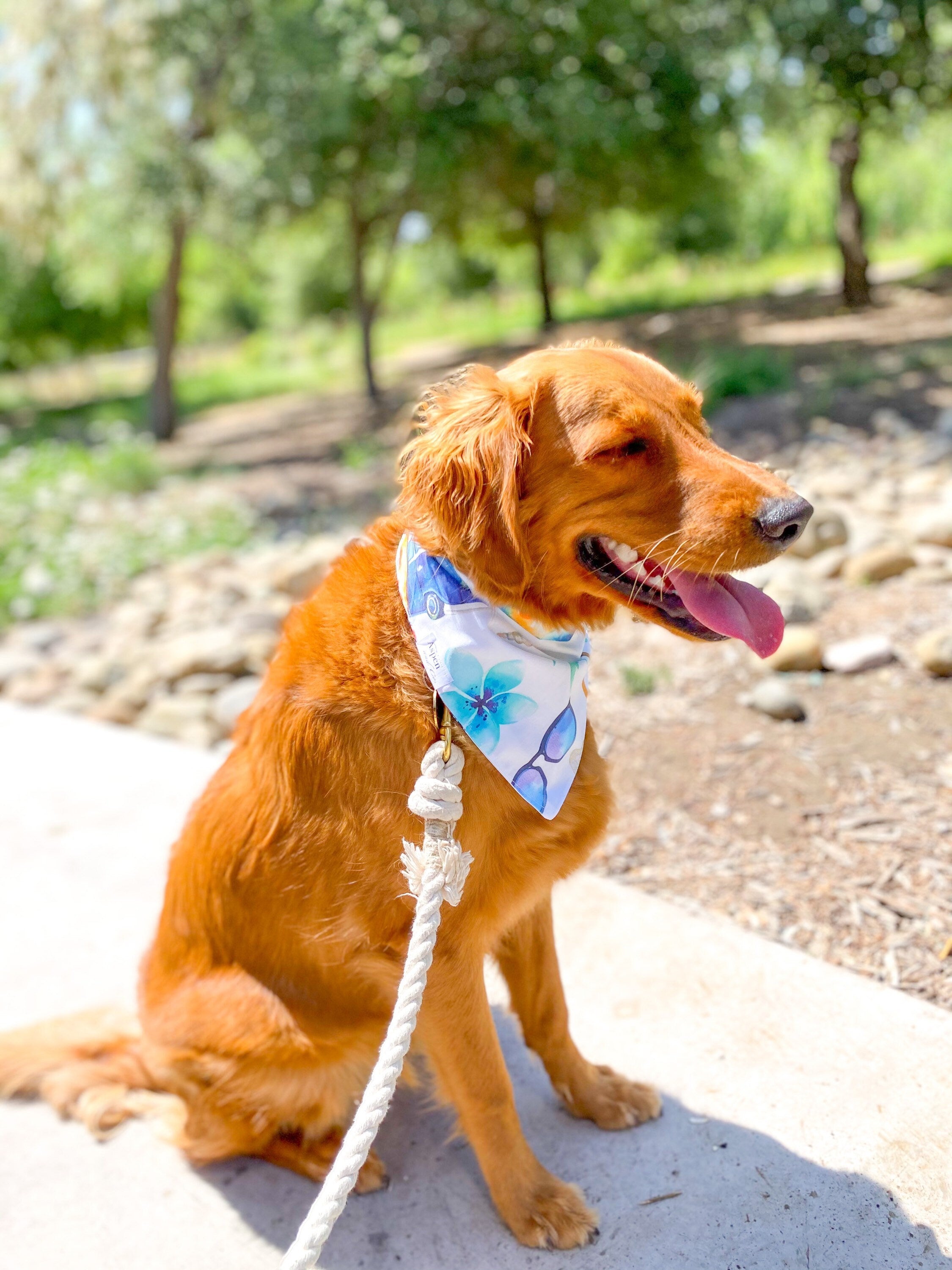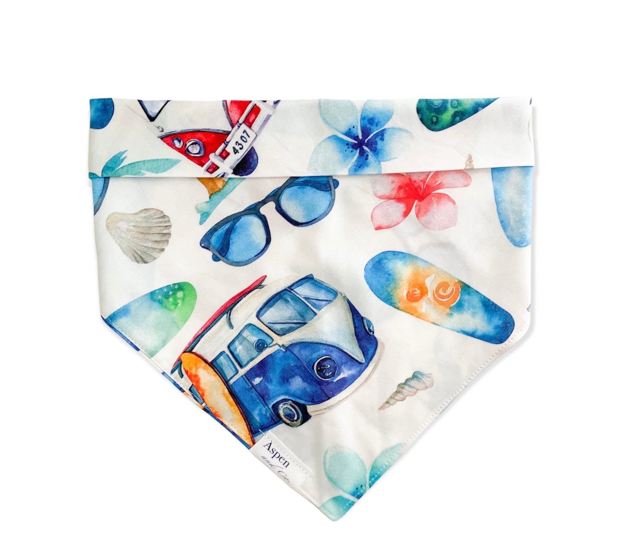 Get ready for a pawsome time with Aspen and Co.'s Beach Bum bandana! This groovy bandana features a colorful surfboard and plumeria design, perfect for your pup's next warm day. Your furry friend will be the coolest dog on the sand (or should we say, day dreaming of  the surf?)!