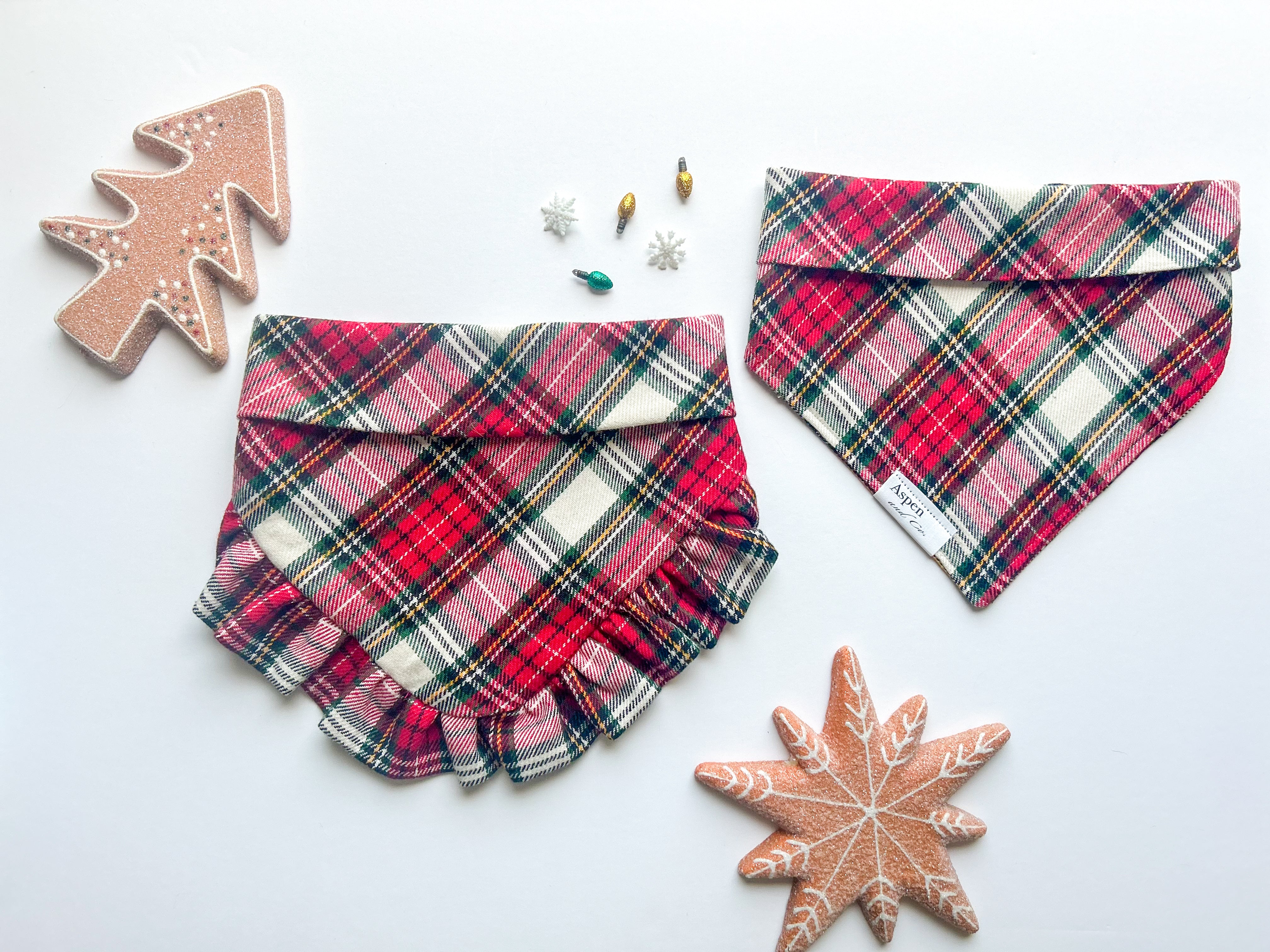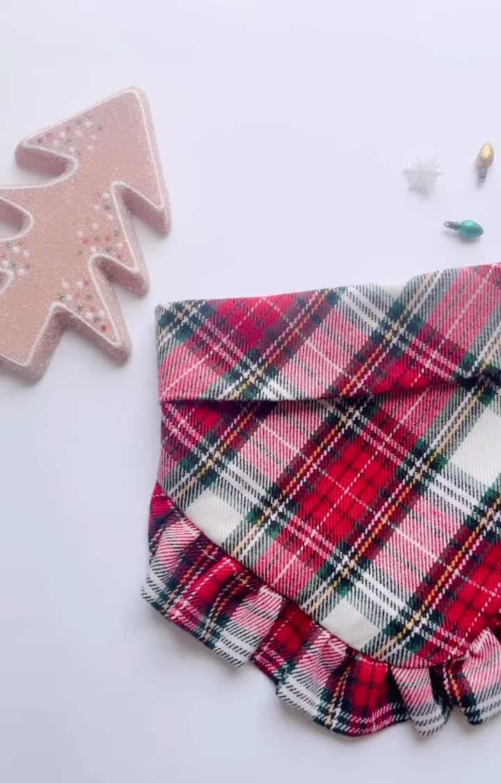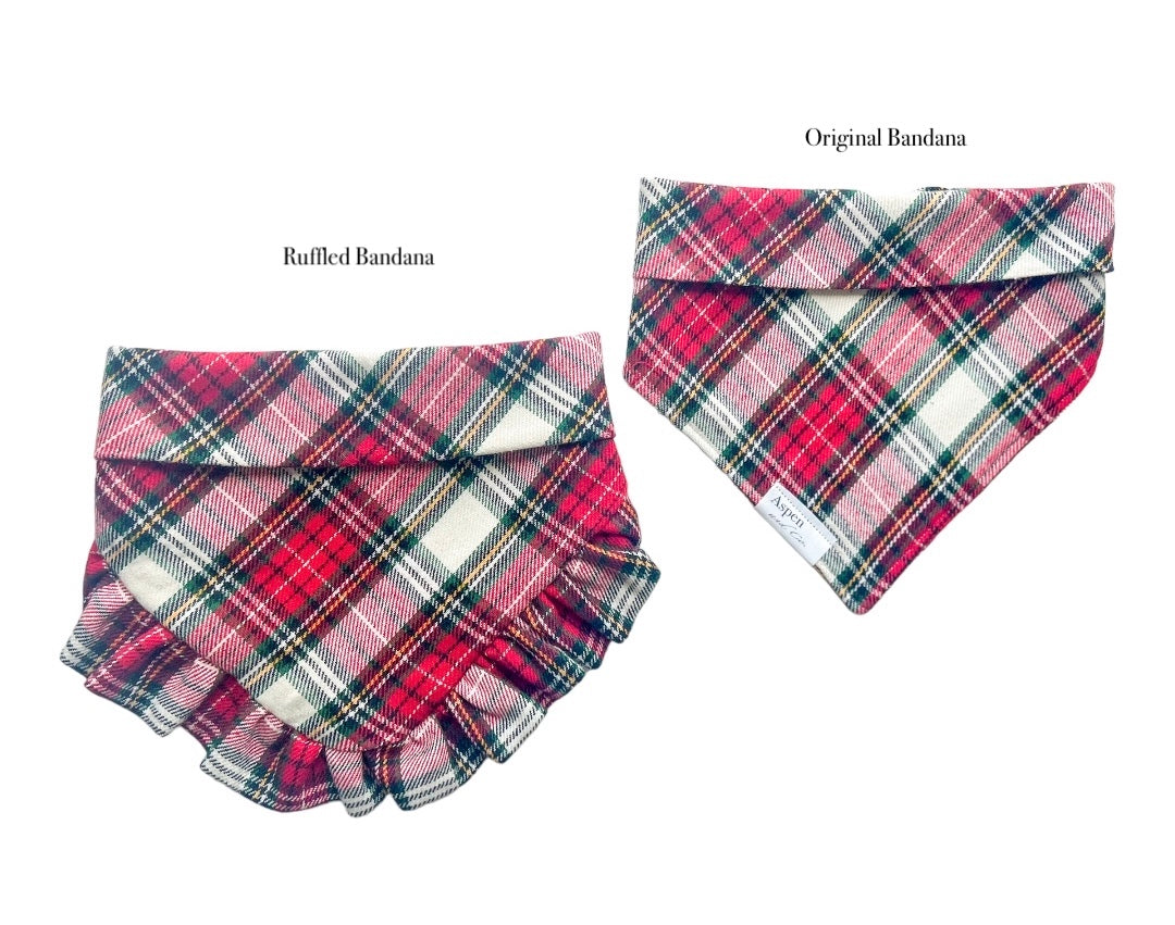 Add some festive flair to your furry friend's wardrobe with our Candy Cane holiday dog bandana with or without ruffles! Handmade with soft flannel and convenient snaps, this cozy accessory is perfect for the holiday season. Great for boy or girl dogs, it'll have them looking paw-some all season long!