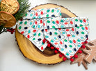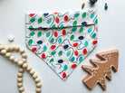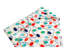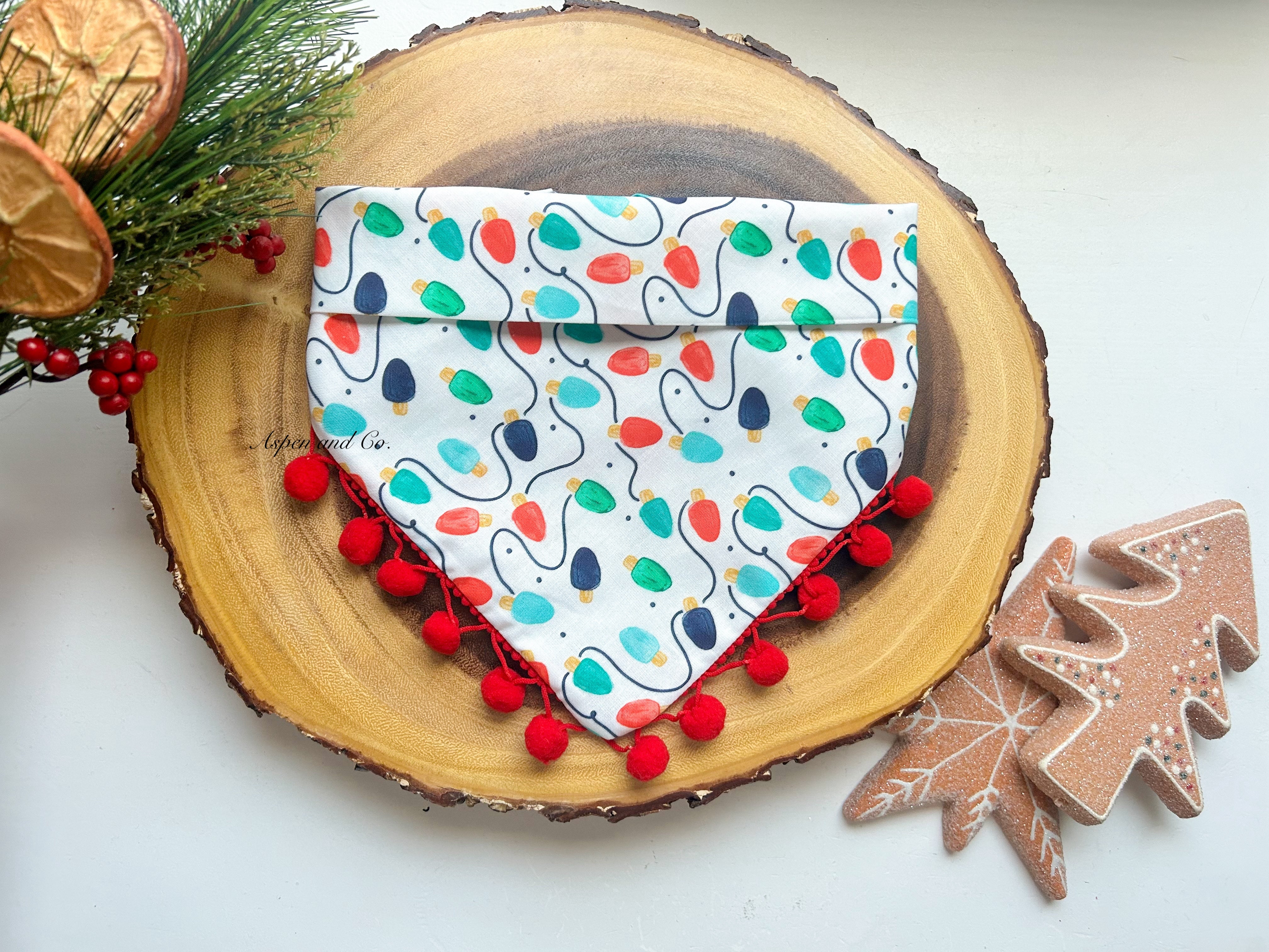 This Christmas Lights Dog Bandana features a cheerful pattern of red, green, and blue string lights on a snowy white background, available with or without festive red trim for an extra pop of holiday spirit.