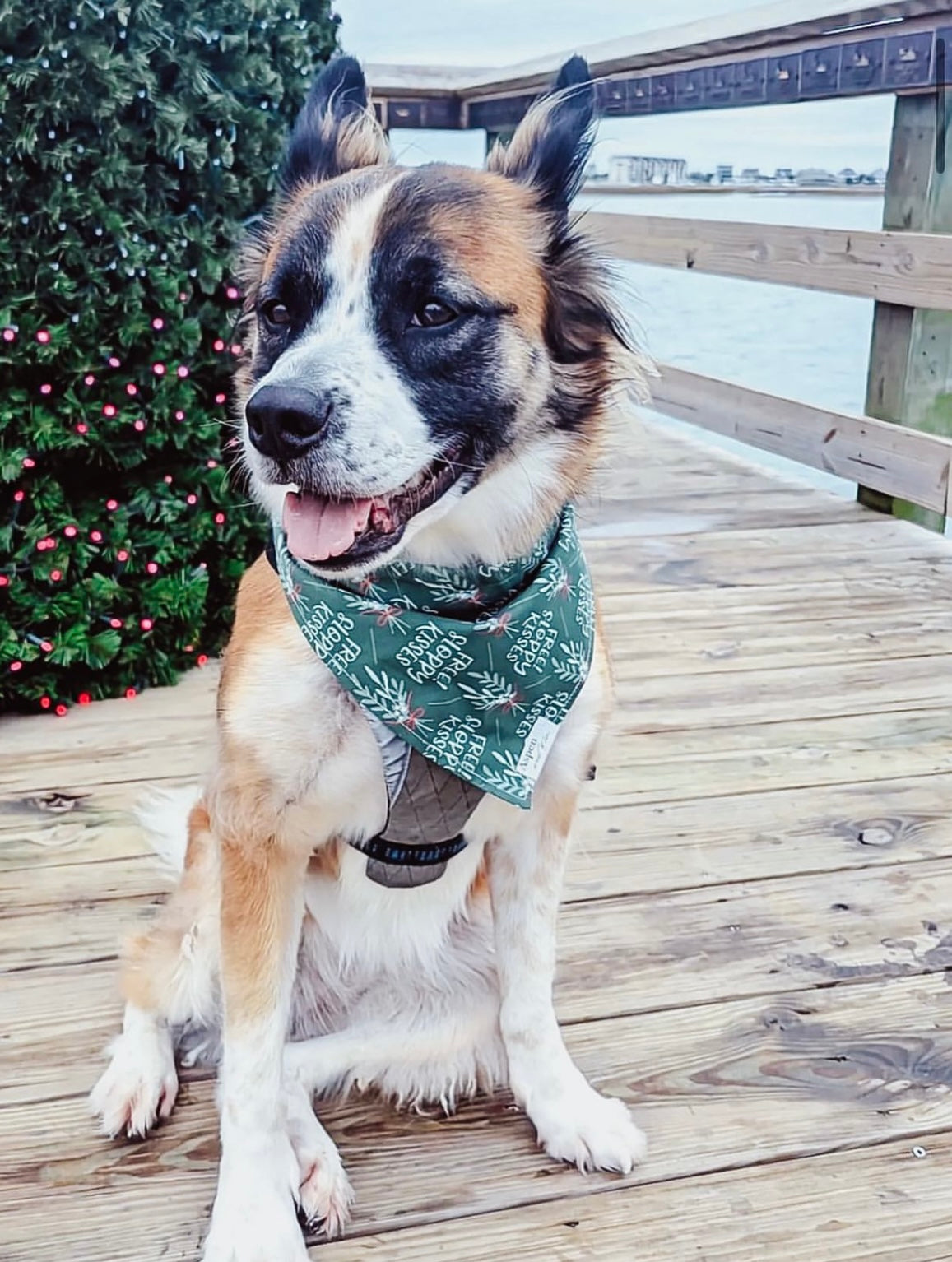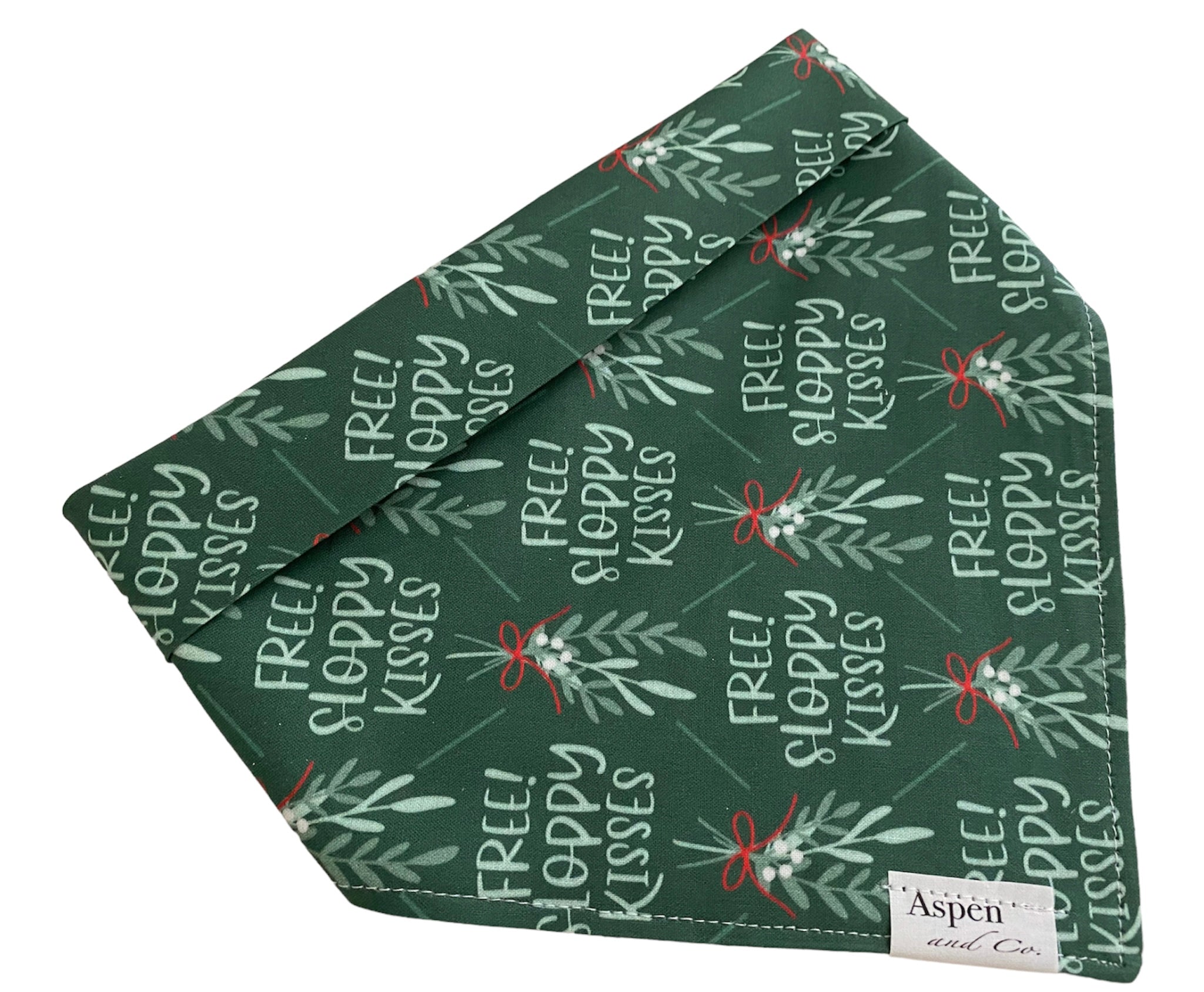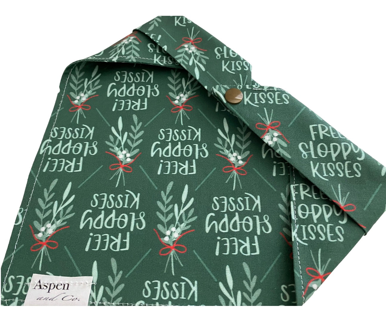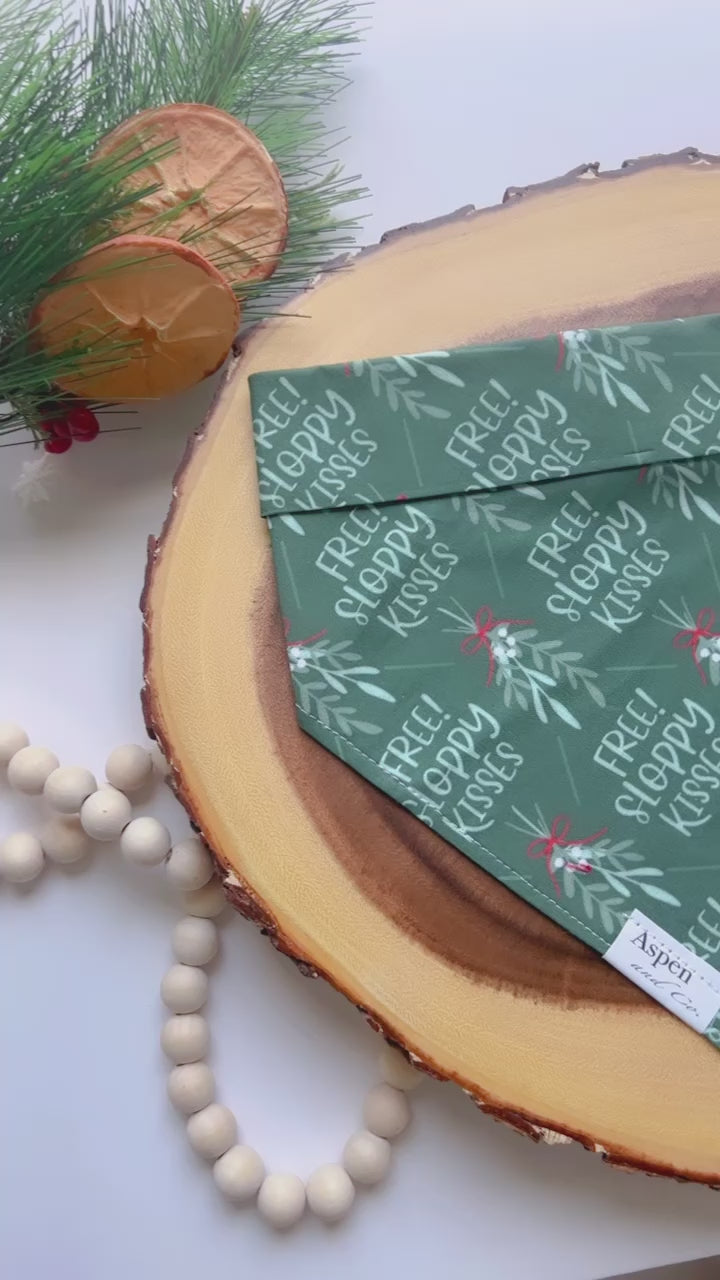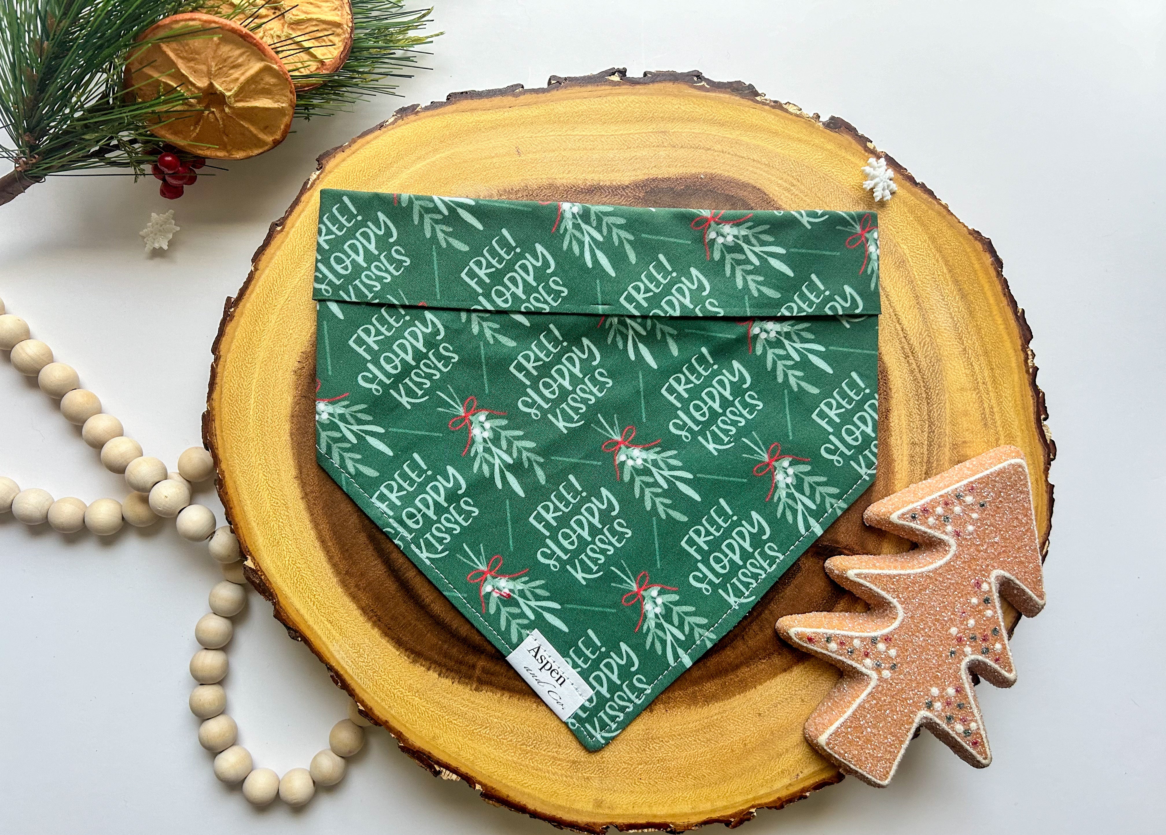 This “Free Sloppy Kisses” dog bandana features a deep forest-green background printed with cheerful mistletoe sprigs and white script. It’s the perfect mix of cozy holiday charm and playful personality, ideal for Christmas photos, parties, or cozy winter walks.
