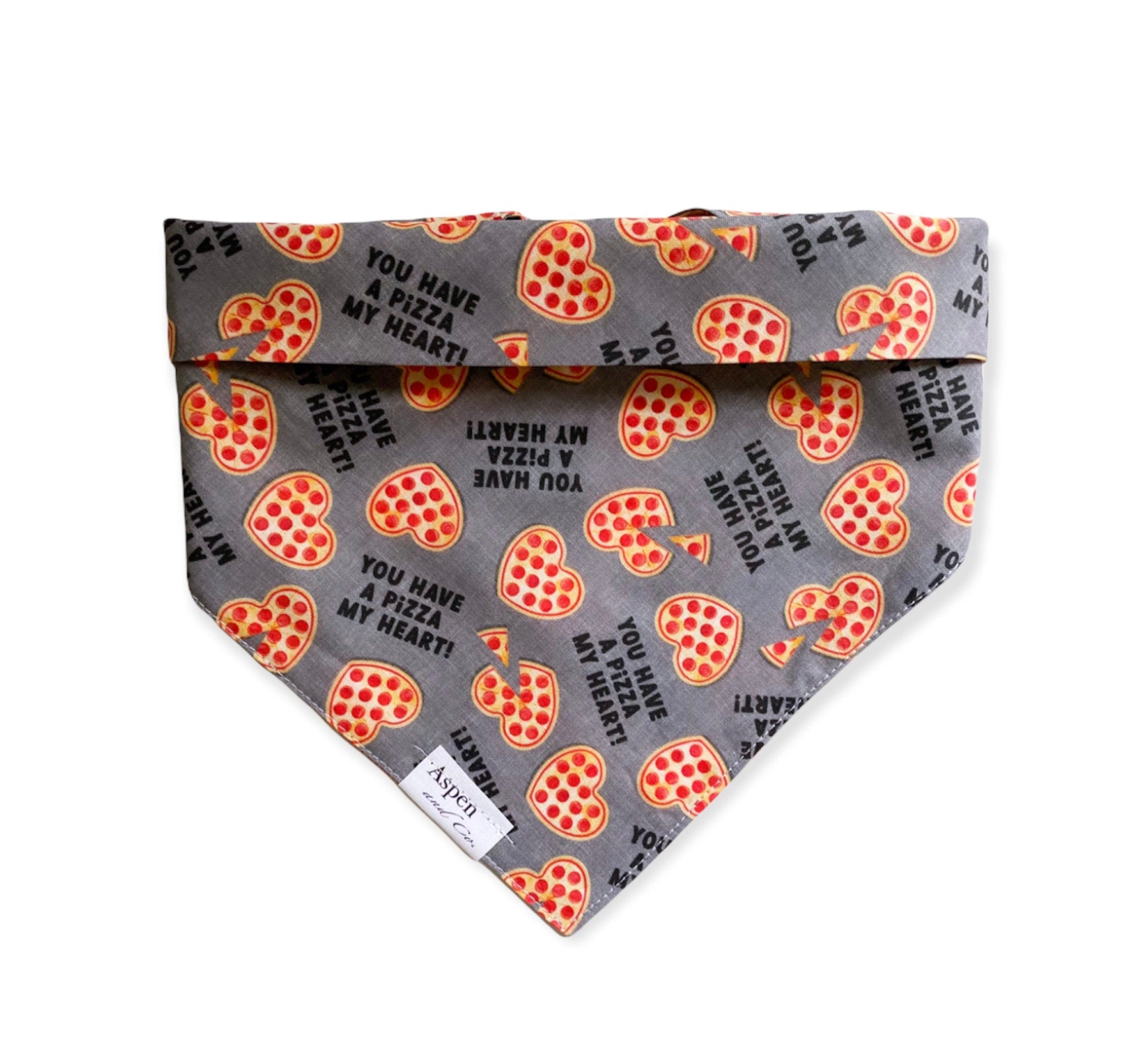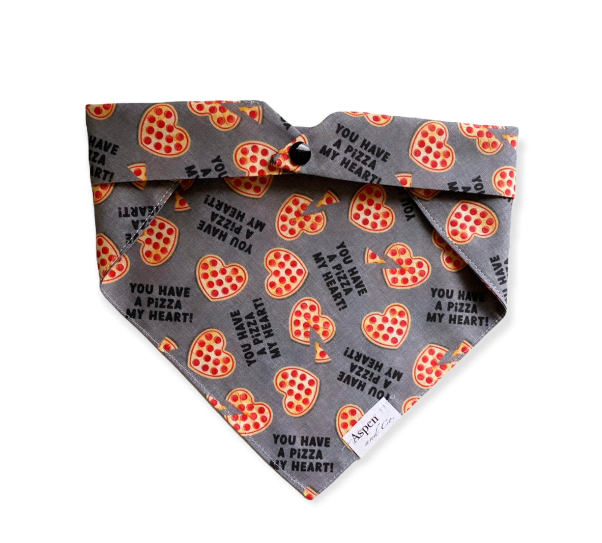 Spoil your pup with the Pizza My Heart bandana! Perfect for pizza-loving dogs, this bandana features heart-shaped pizzas and the punny quote "you have a pizza my heart." Made with premium cotton and easy snap closures. Treat your dog to some cheesy, adorable flair!