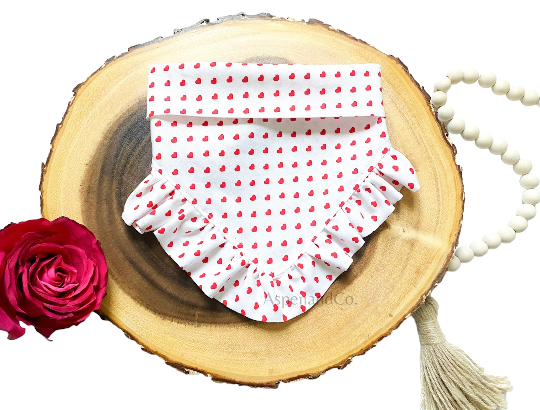 Make your pup stand out with our exclusive Ruffled Sweetheart Dog Bandana in white. Handmade with lightweight cotton and adorned with petite red hearts, this bandana is the perfect accessory for a sophisticated and stylish look. Mix and match with our add-on matching accessories for a complete, luxury outfit.